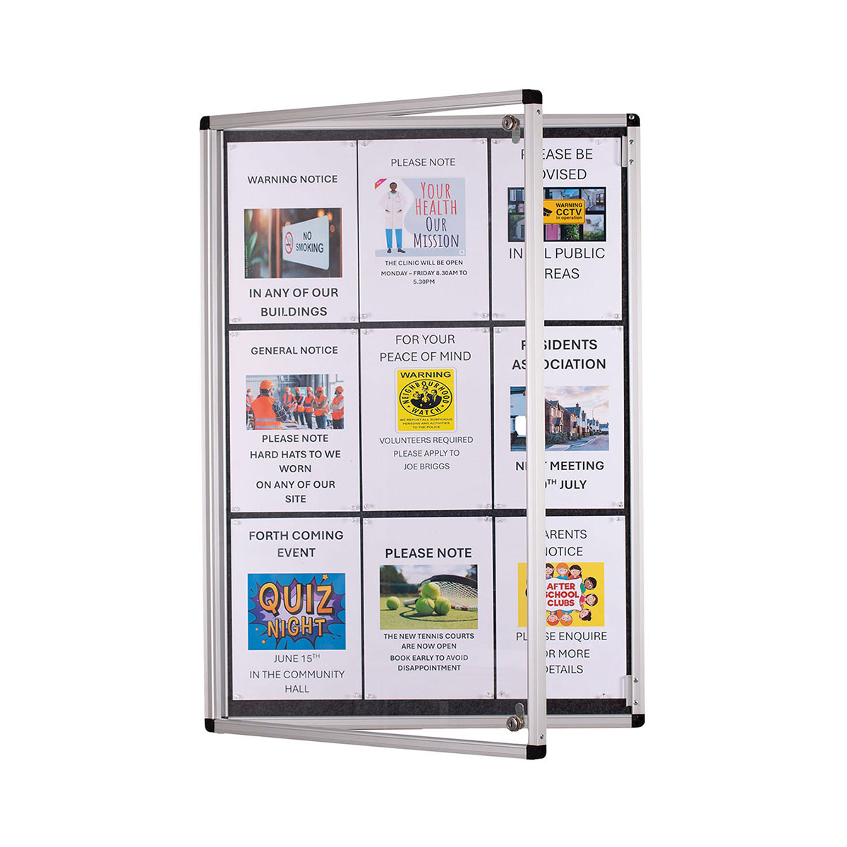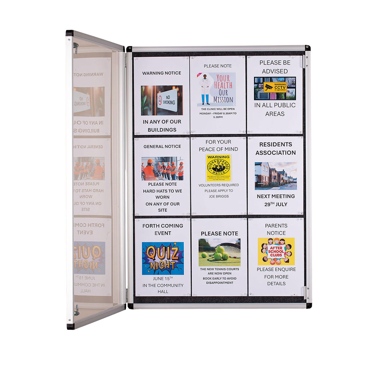 Almost entirely made from recycled and recyclable materials, these boards are assembled in the UK to the highest standards. They come equipped with quality hinges, matching locks, full-length glazing bars, and shatterproof doors. The side-hinged doors with 2 identical locks are designed to protect displayed information from casual interference.