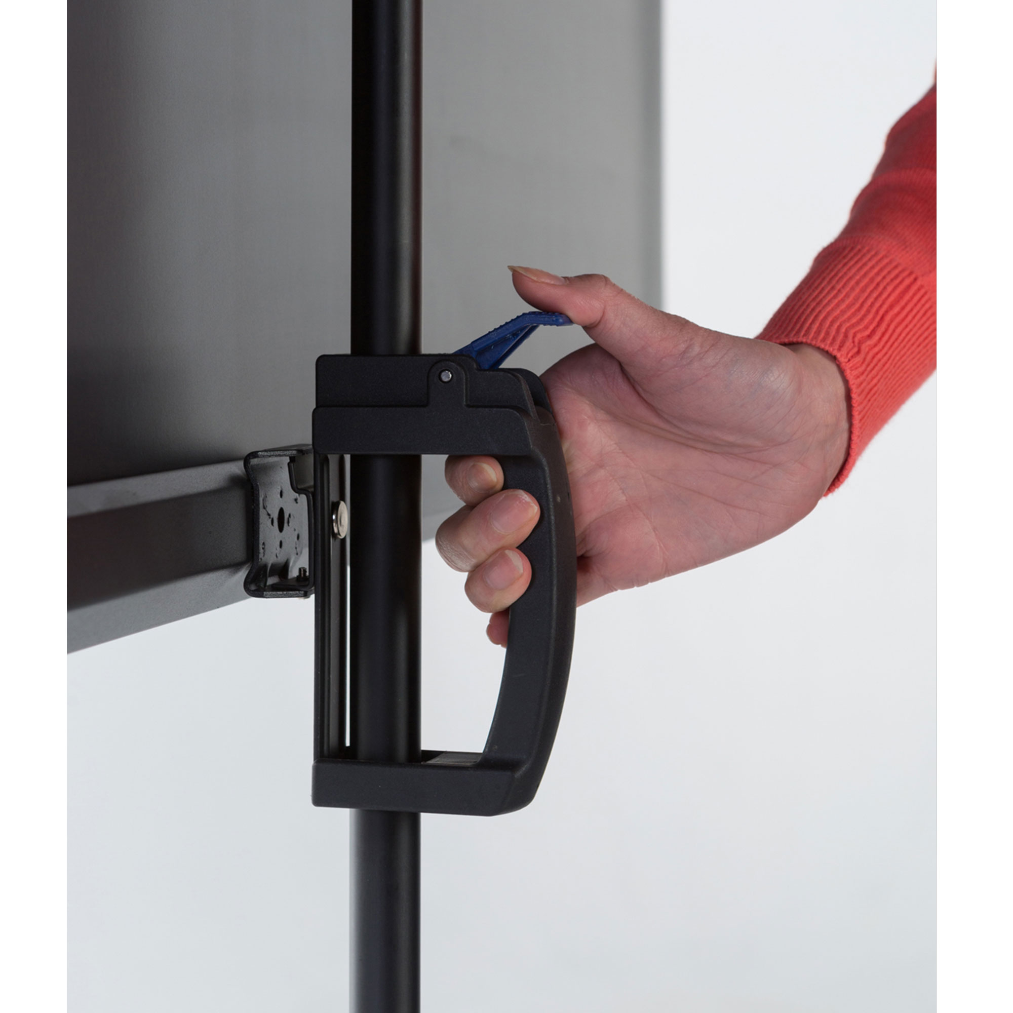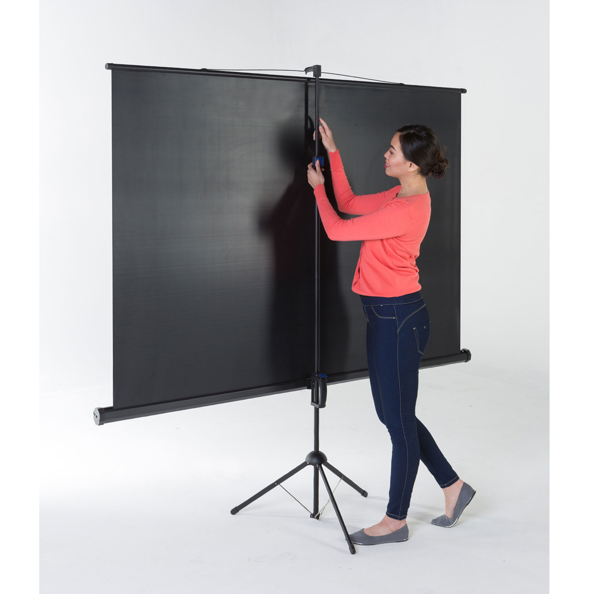 This portable projection screen features a sturdy tripod base and a matte white cloth surface. The black borders enhance the projected image, ensuring a professional presentation. Its heavy-duty folding tripod stand provides stability, and the screen is fully height-adjustable. Additionally, it includes built-in 'keystone' correction for improved image quality