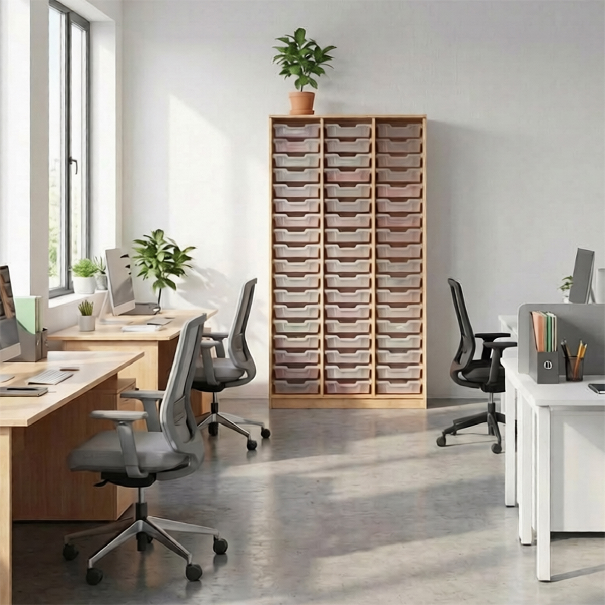 This locking cabinet features a wide-height adjustable shelf as well as 18 shallow Gratnell trays. The cabinet is available in beech or maple finish and the trays are available in a wide range of colours Heavy-duty steel wheels, 2 with brakes, are fitted for maximum durability and the doors are fitted with safety hinges