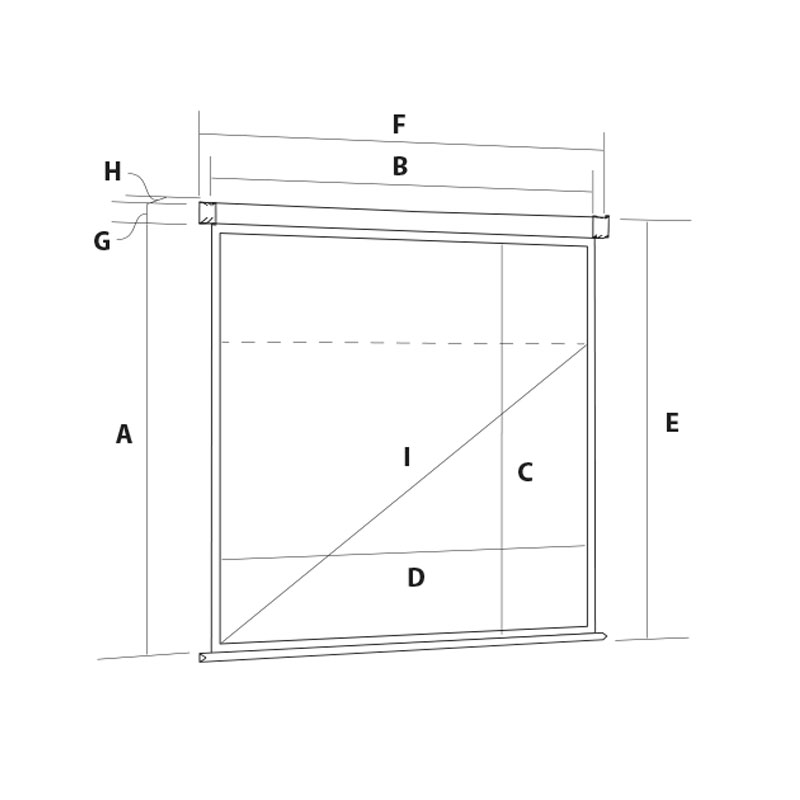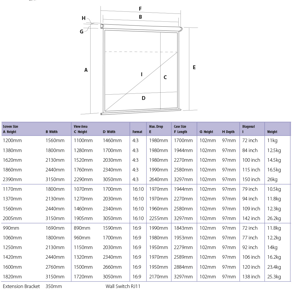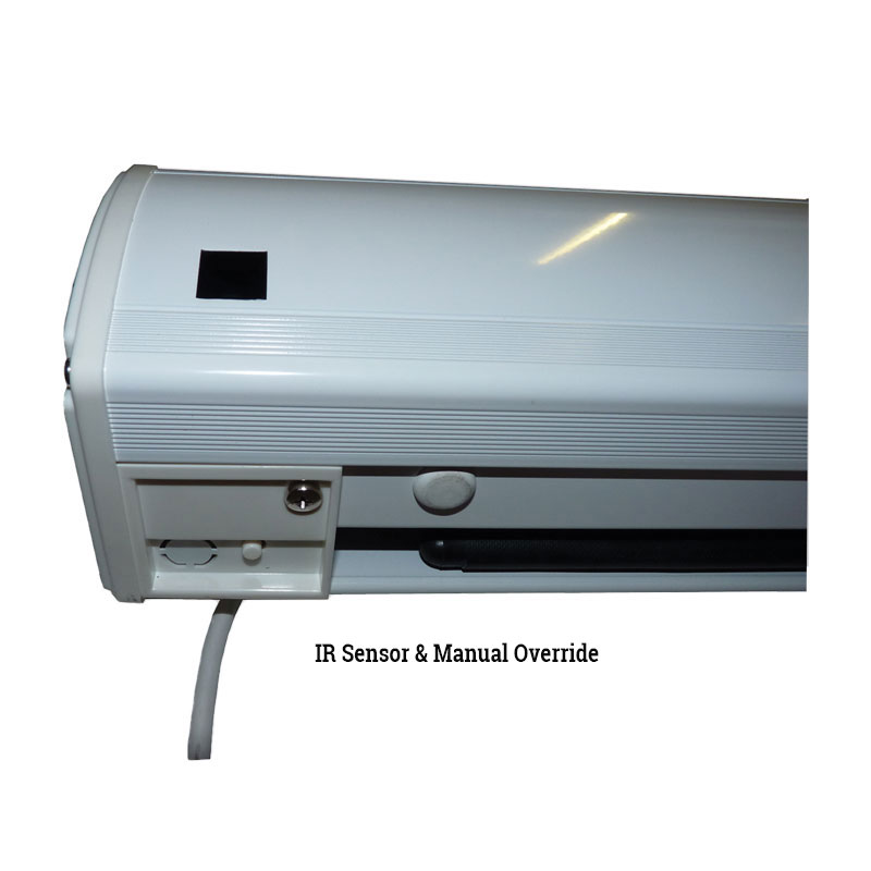 • High-quality matte screen cloth • Professional finish black borders • Adjustable wall or ceiling mounting points • No electrical installation required • Supplied with an Infra-red remote, 2.7-metre cable and 13amp plug. A ready to use, professional projection screen for operating with an IR remote. The screen cloth is high quality matte white providing a crisp flat viewing surface. 50mm black borders and extended drop, depending on viewing area and format selected. There is an IR extension cable for use if the case sensor is obstructed and a 12v trigger with a 10metre cable for operation with a projector. A manual override button is also built-in underneath the screen for fail-safe operation without the remote. The sliding channel fix method enables the screen to be mounted to either a wall or ceiling by selecting the best fixing points i.e. studs. A pair of Extension Brackets are available as an accessory for avoiding obstructions as the screen descends. No electrical installation is required as the screen is supplied with a 2.7-metre cable and 13 amp plug. Please see size guide image for all specific measurements.- High-quality matte screen cloth
