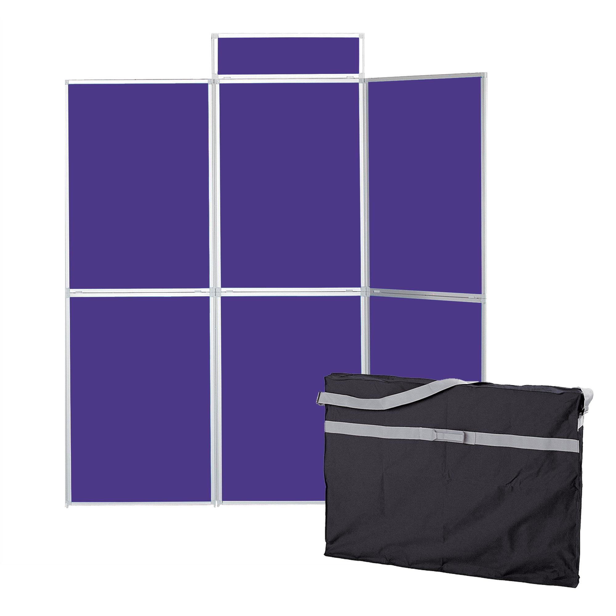 Robust aluminium framed heavy duty display system with interlocking gear hinges provide a sleek and professional display. Perfect for a larger temporary exhibition for displaying information, art, classwork, tradeshow promotions. A portable and robust Folding 6 Panel Display System covered in loop nylon fabric allowing quick and easy display using pins or with self adhesive hook fasteners. A header panel is included should it be required. A unique sliding mechanism locks the top and bottom panels securely together. Easy to put up and take down, a carry bag is included for protection, transporting and storing your aluminium display system.- Dimensions H x W (mm) Panels: 1000 x 700. Header Panels: 200 x 700. Overall Size: 2200 x 2100