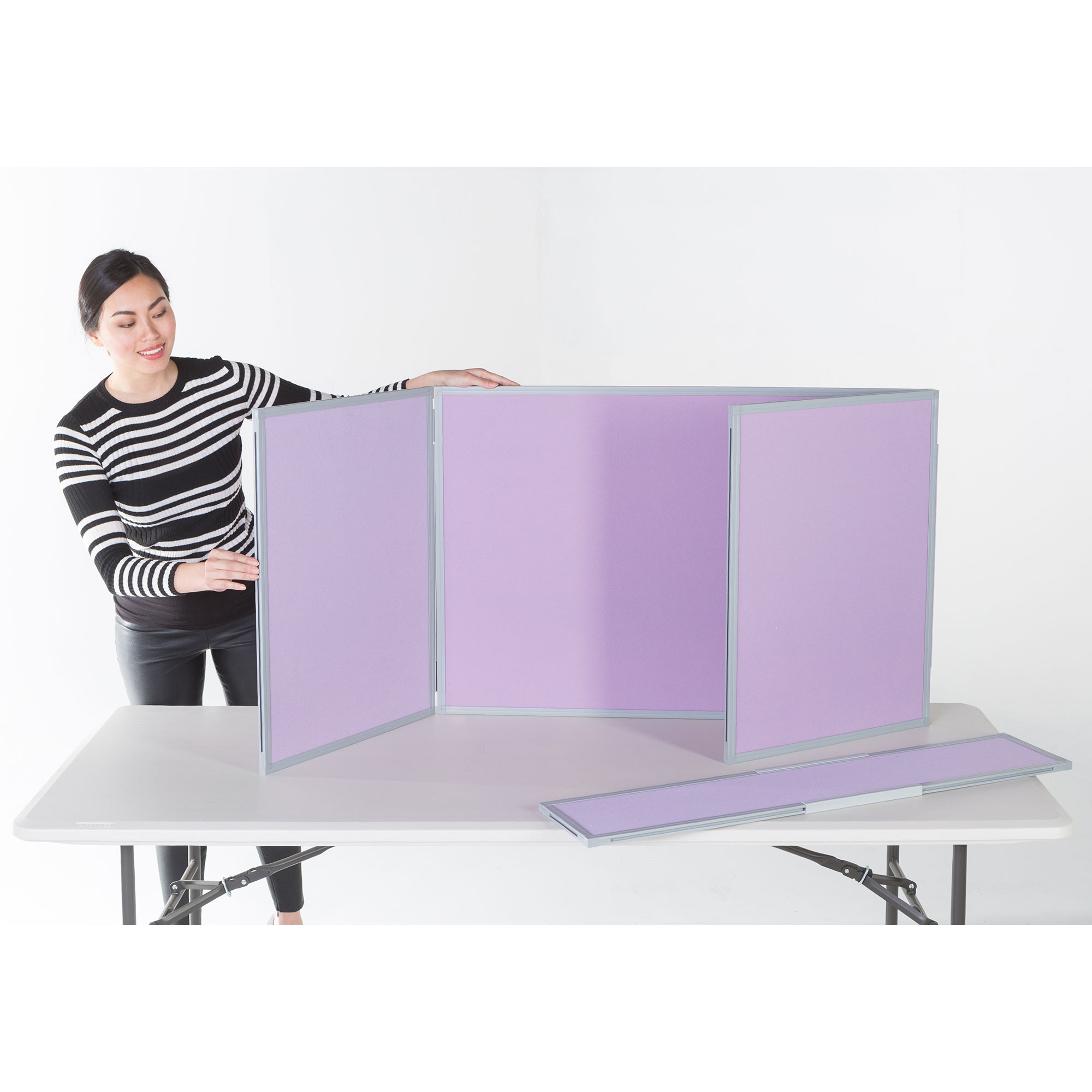 Our landscape Table Top Folding Display System will enable you to set up your table top display in minutes providing a smart backdrop for your class presentation, exhibition or information stand. The panels are covered with loop nylon fabric allowing quick and easy display using pins. Easy to put up and take down, a carry bag is included for protection, transporting and storing your display system. Can be used with or without the header panel.- Dimensions H x W (mm) Centre Panel 600 x 900. Side Panels: 600 x 450. Header Panel: 200 x 900.