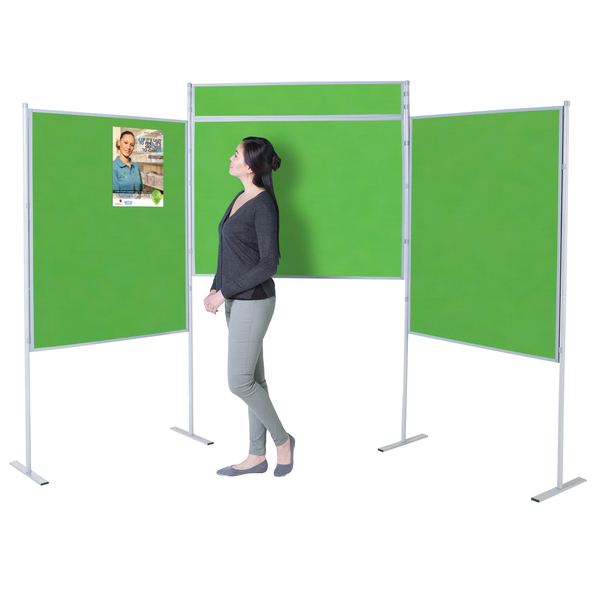 This lightweight 3-panel display kit is perfect for when you need a large display area (3 square metres on both sides) for information, art, classwork, careers evening or any impromptu presentation. The 3 panels are covered in loop nylon fabric allowing quick and easy display using pins or hookfastners (Supplied with a pack of 100 adhesive hook fasteners (Busyfix®) to get you started. This kit has 2 header panels, one white on one side/ black on the reverse and the other with fabric both sides. Quick and easy to assemble, the poles screw into the feet and the panels simply click into position on the poles.