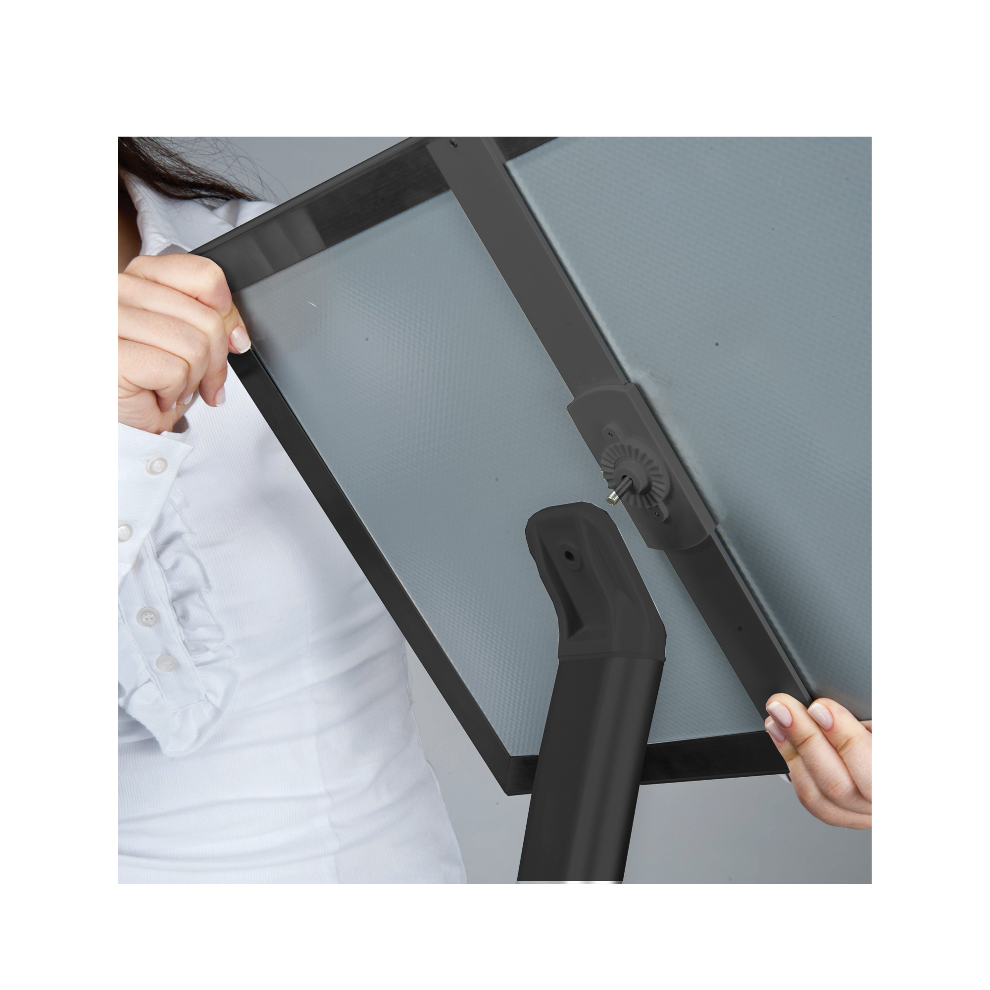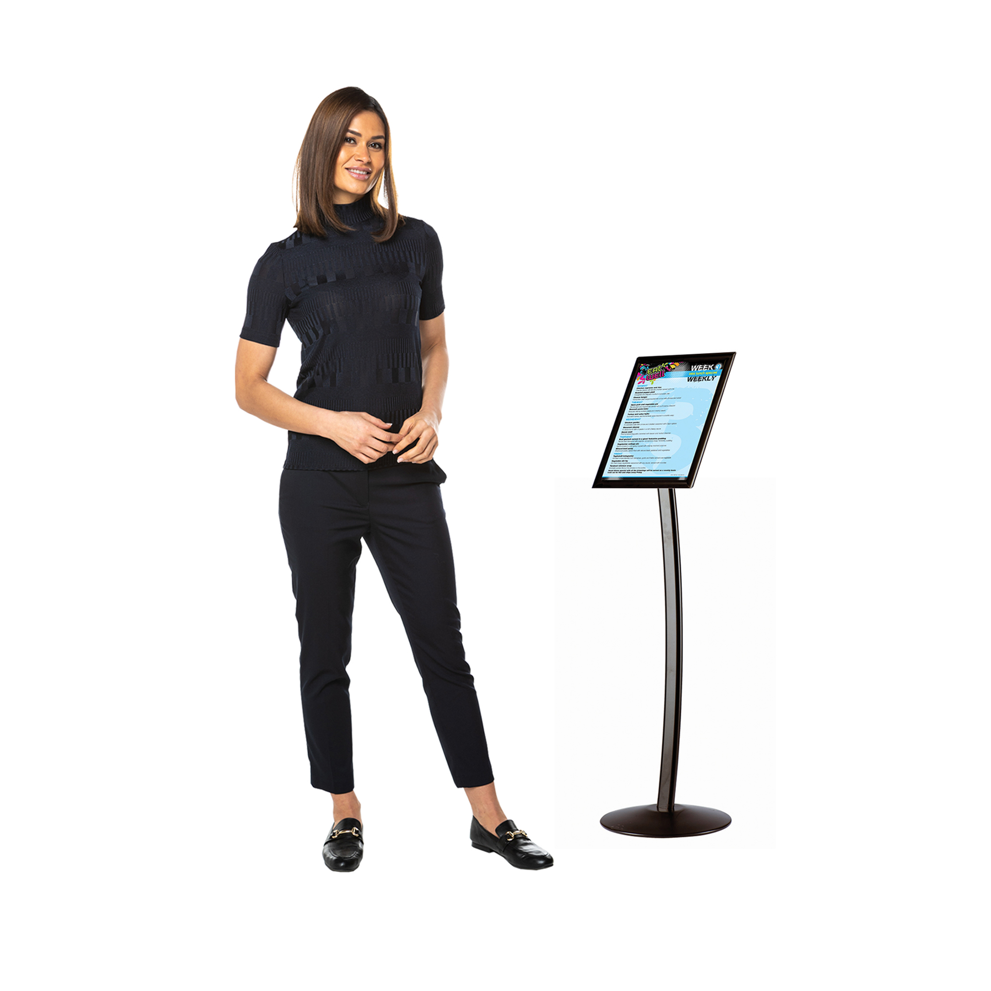 This attractive curved black stand is available in 2 sizes - A4 or A3 sized frames to display menus, sales literature, posters etc. The snap frame is mounted at the optimium viewing angle and adjusts for horizontal or portrait orientation. The coated curved aluminium post is attached to a stable steel base. Designed for indoor use.- Available in 2 sizes