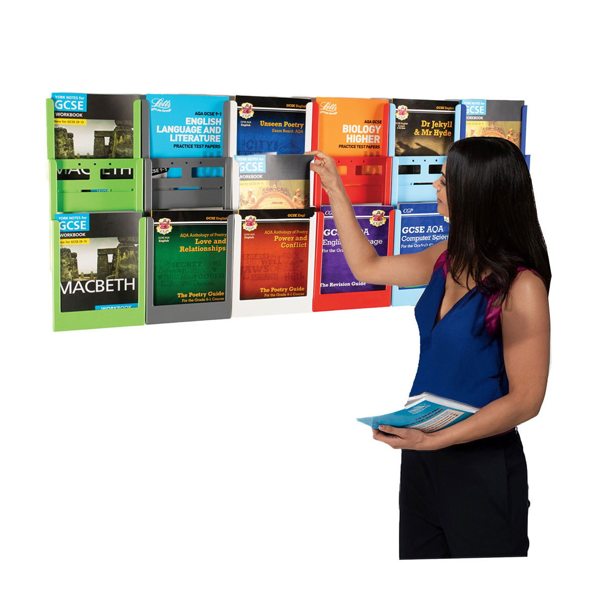 Assembling the rail is easy: attach it to the wall using the included fixings. Then, snap the holders together according to the instructions, and hang the columns on the rail. The thoughtfully designed pockets display over 50% of the cover, ensuring that your literature stays securely in place and does not fall forward.