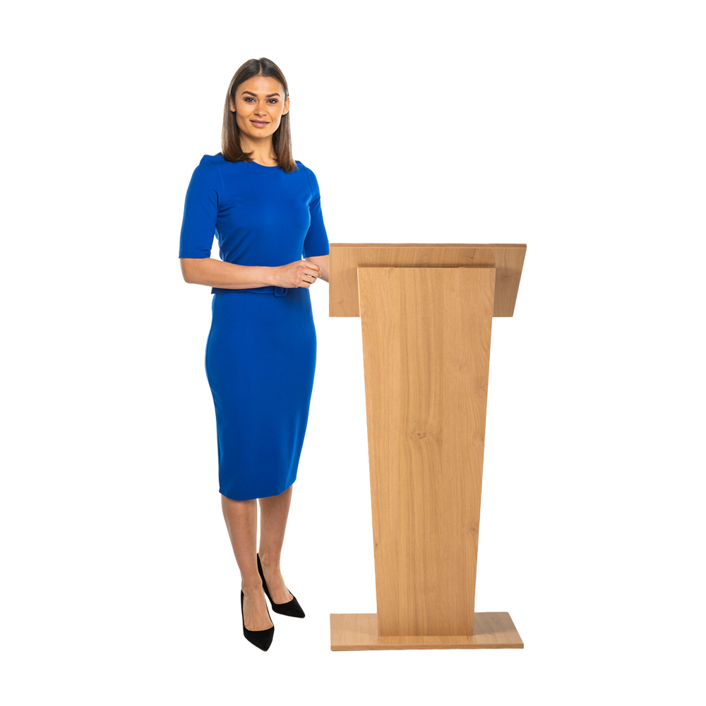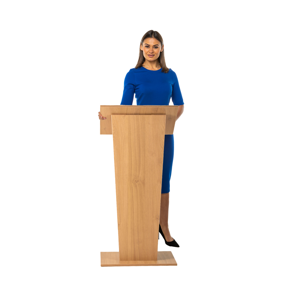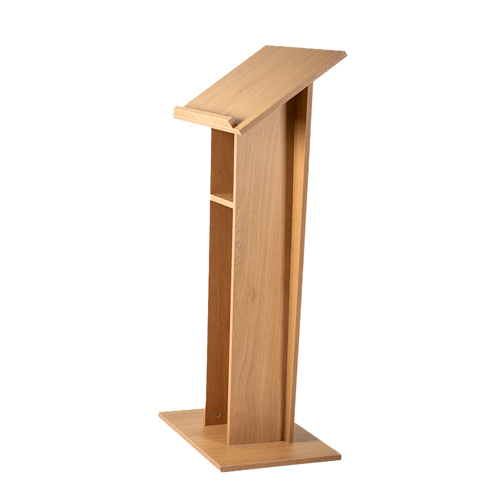 This elegant lectern with a black, maple, or oak MFC finish is designed to be the centrepiece of any presentation, speech, or event. The angled platform has a ledge to support a laptop, tablet, or upper notes and a discreet shelf for extras. A contemporary, yet functional piece of furniture, which will add a touch of class to your next presentation, whether it be a conference room, church, or auditorium.