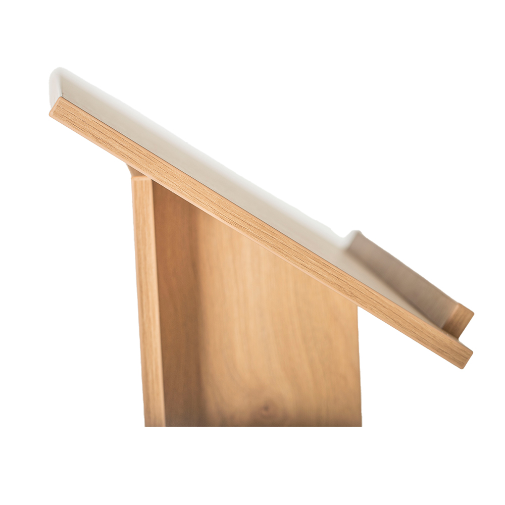 An attractive new lectern that folds in half for storage. The angled platform is adjustable to 20° and 40° to suit a laptop/tablet or paper notes. Cable management is provided through to ground level. Three finishes are available black, maple and beech.