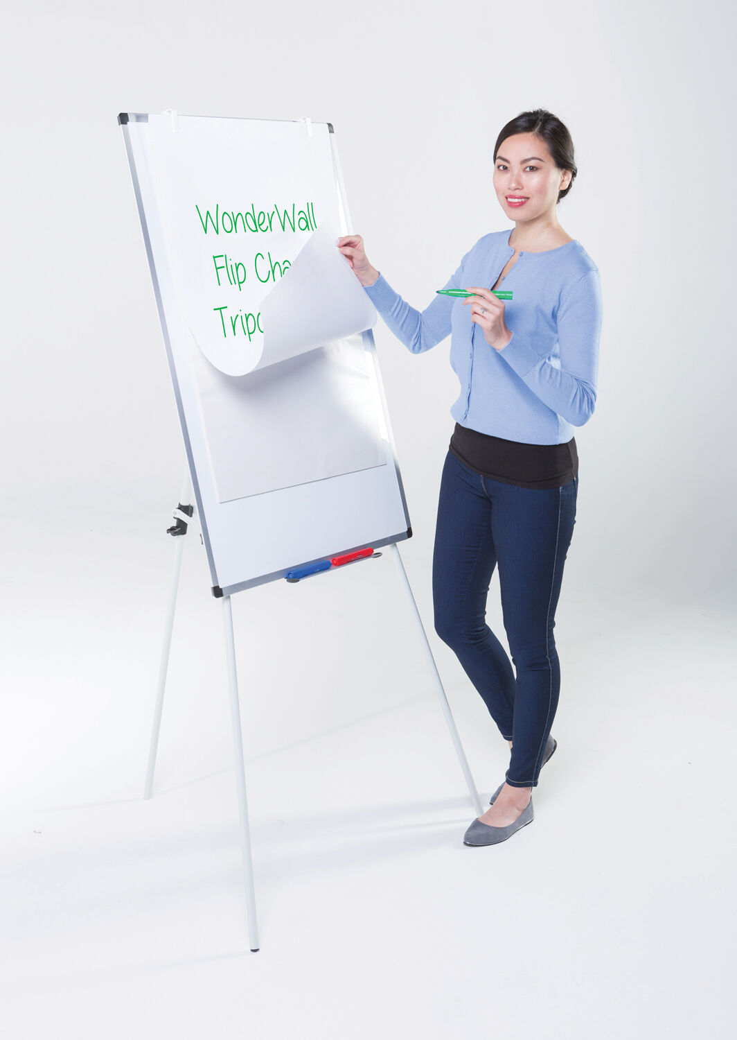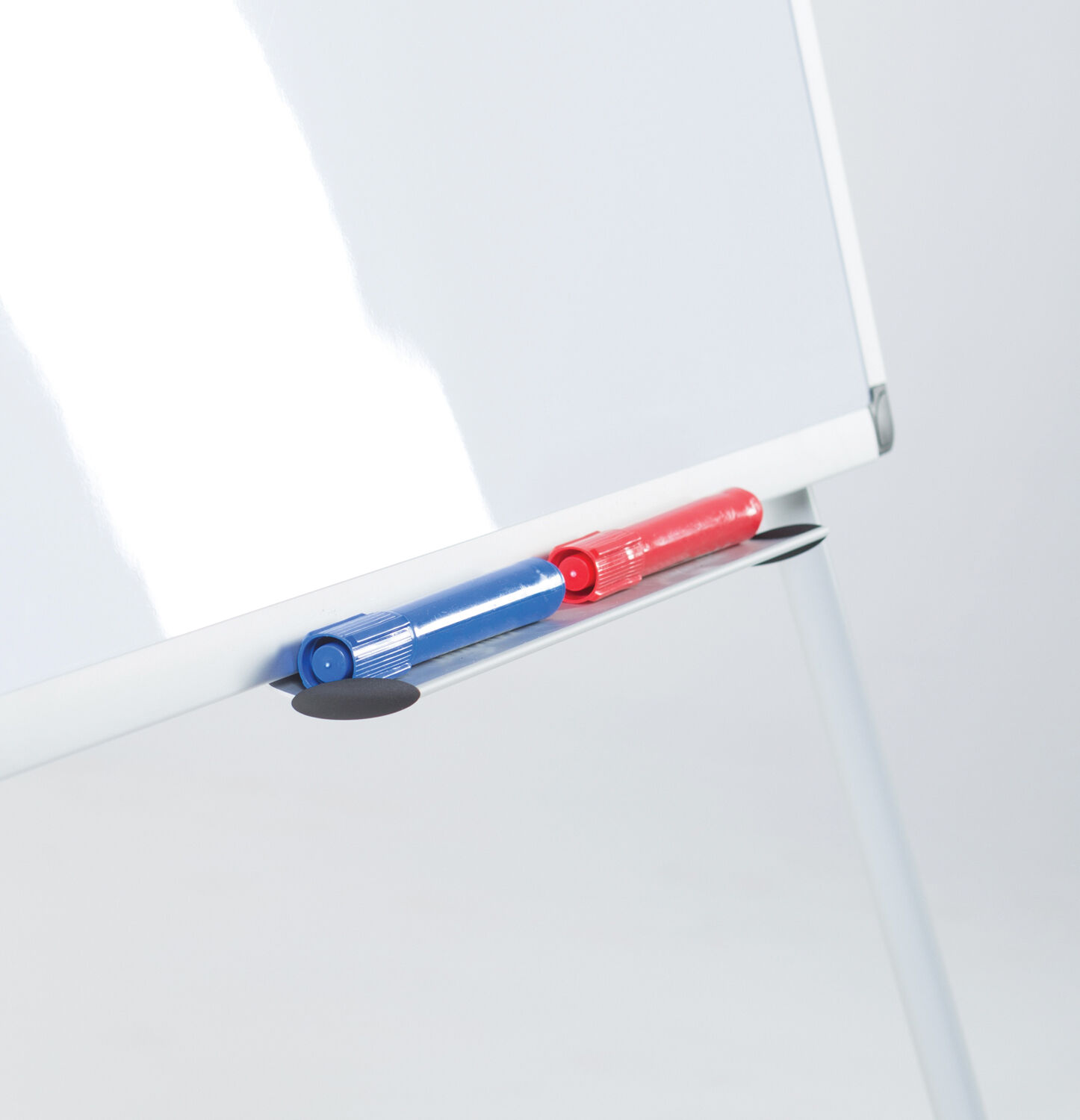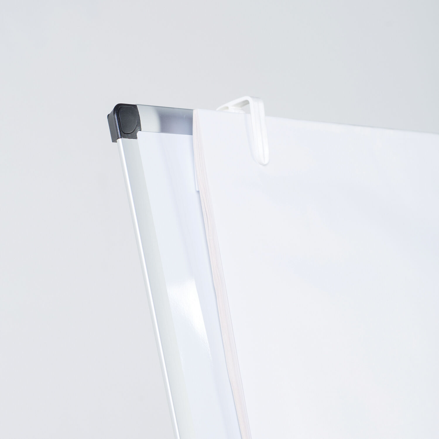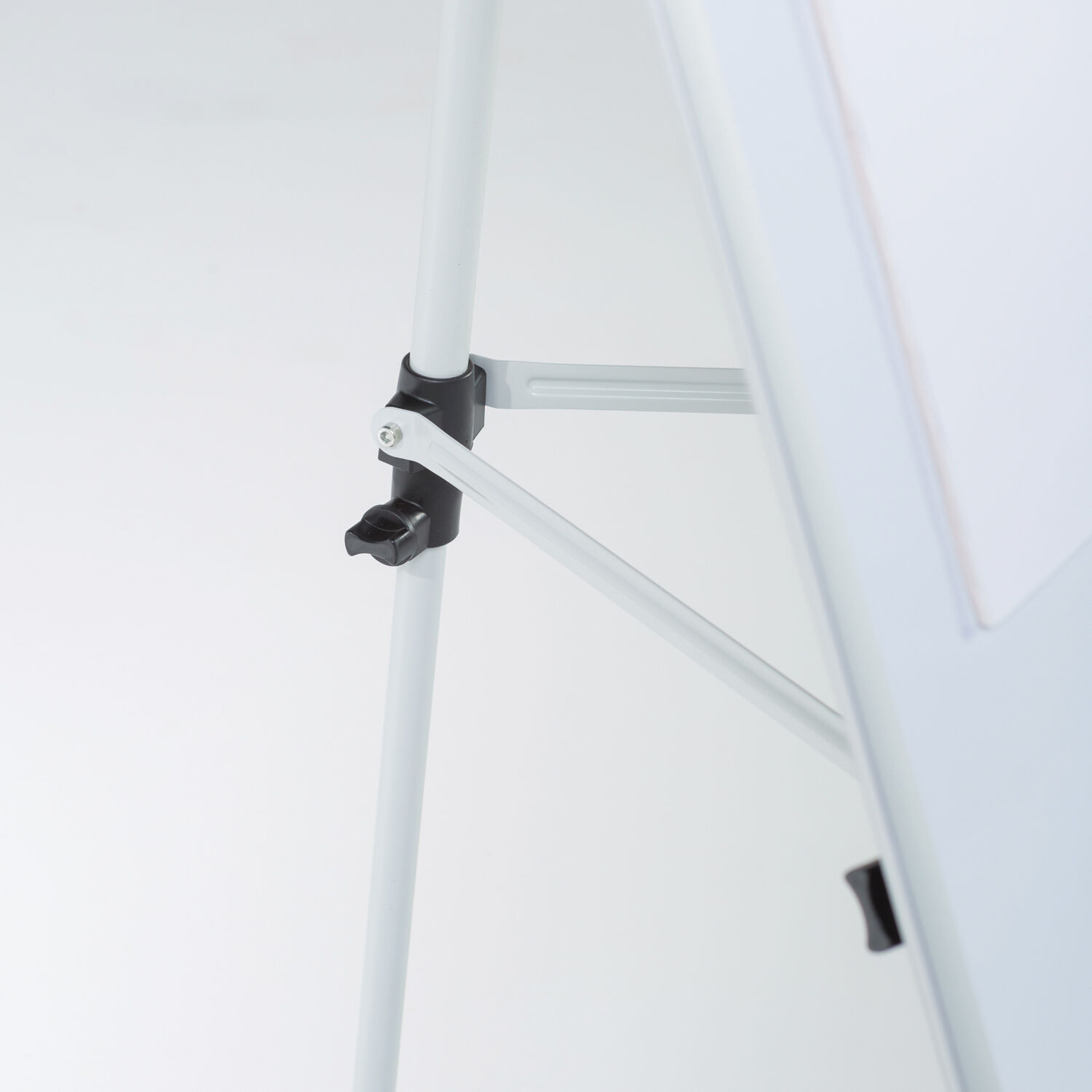 A light tripod flipchart easel is height adjustable and supplied with an integrated pen tray. The dry-wipe whiteboard surface accepts magnets and is suitable for use with dry erase pens. Supplied with two adjustable flipchart paper hangers to use with A1 flipchart pads. The rear leg has a brace for increased strength and stability.