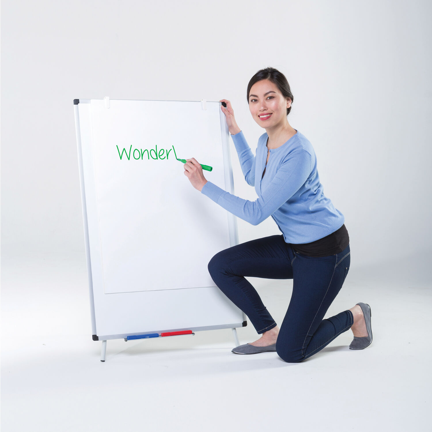 The Professional Mobile Magnetic Flipchart Easel is both portable and height-adjustable. Display completed pages by using the integrated sidearm and adjust the height to use whilst seated. Integrated wheels for easy movement . Use dry wipe pens on the dry wipe magnetic steel surface. 5 Year Warranty.