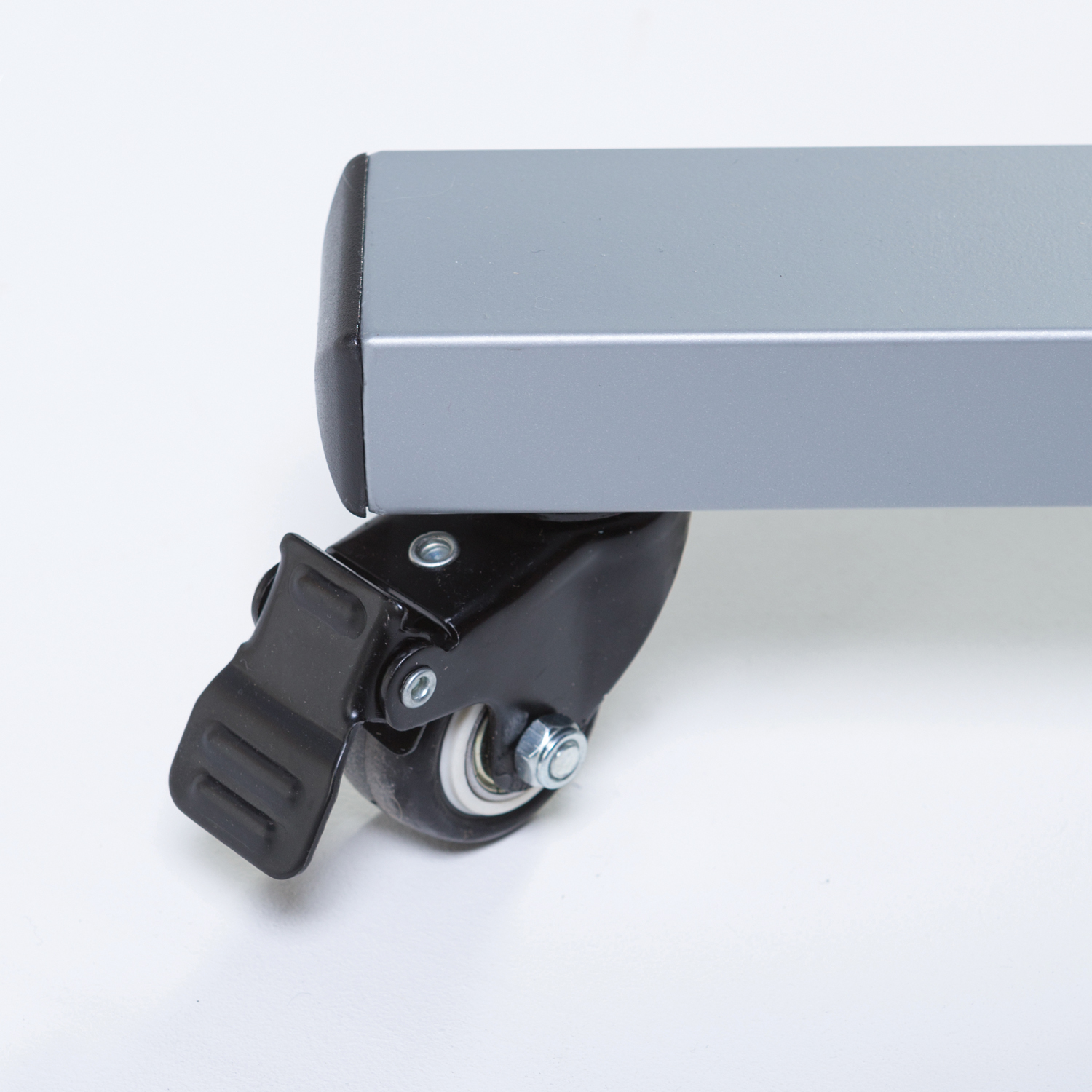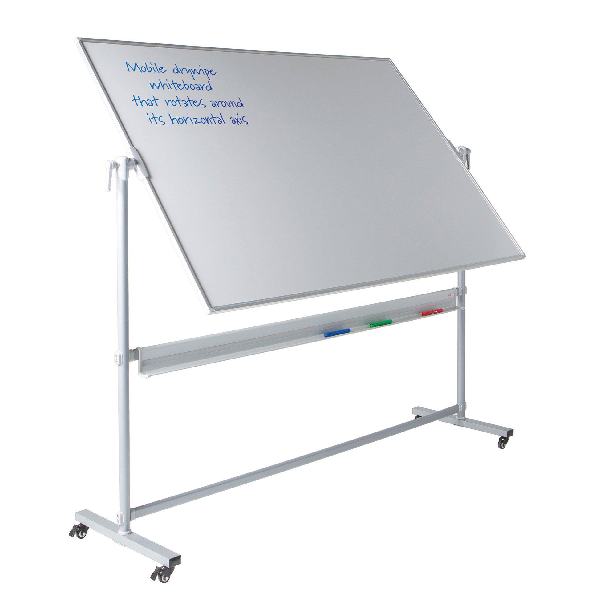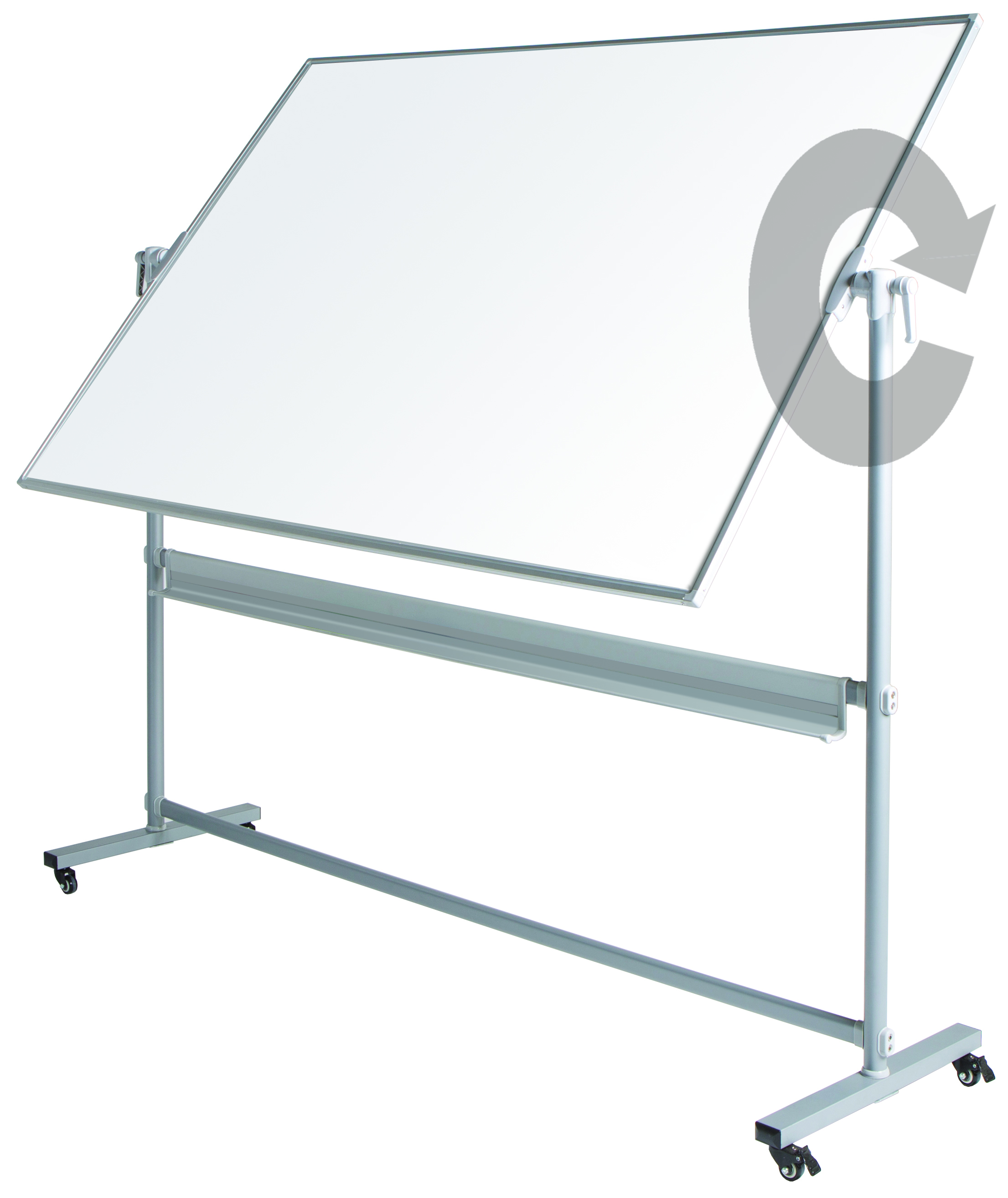 These freestanding double-sided whiteboards rotate on a horizontal axis. The sturdy steel frame features four castors, two of which are locking for stability. Both sides of the whiteboard surface are plain and can hold magnets. Designed for use with dry-wipe markers.