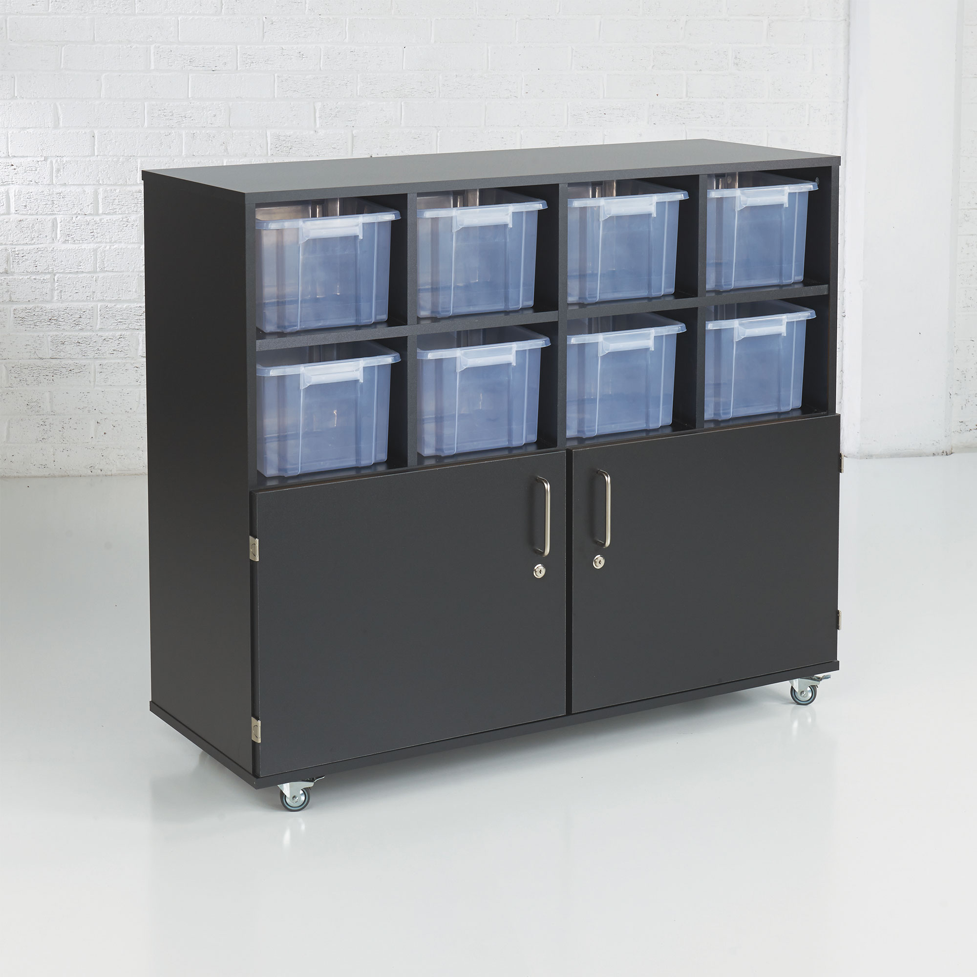This unit has 8 cubby holes to take large plastic tubs as well as 4 shelves secured by locking doors. Heavy-duty steel wheels (2 braked) are bolted through the carcass to ensure maximum durability and the doors are fitted with safety hinges. Delivery date to be confirmed upon receipt of order. This item is made to order and therefore non-returnable.- (H) 1050 x (W) 1222 x (D) 450mm
