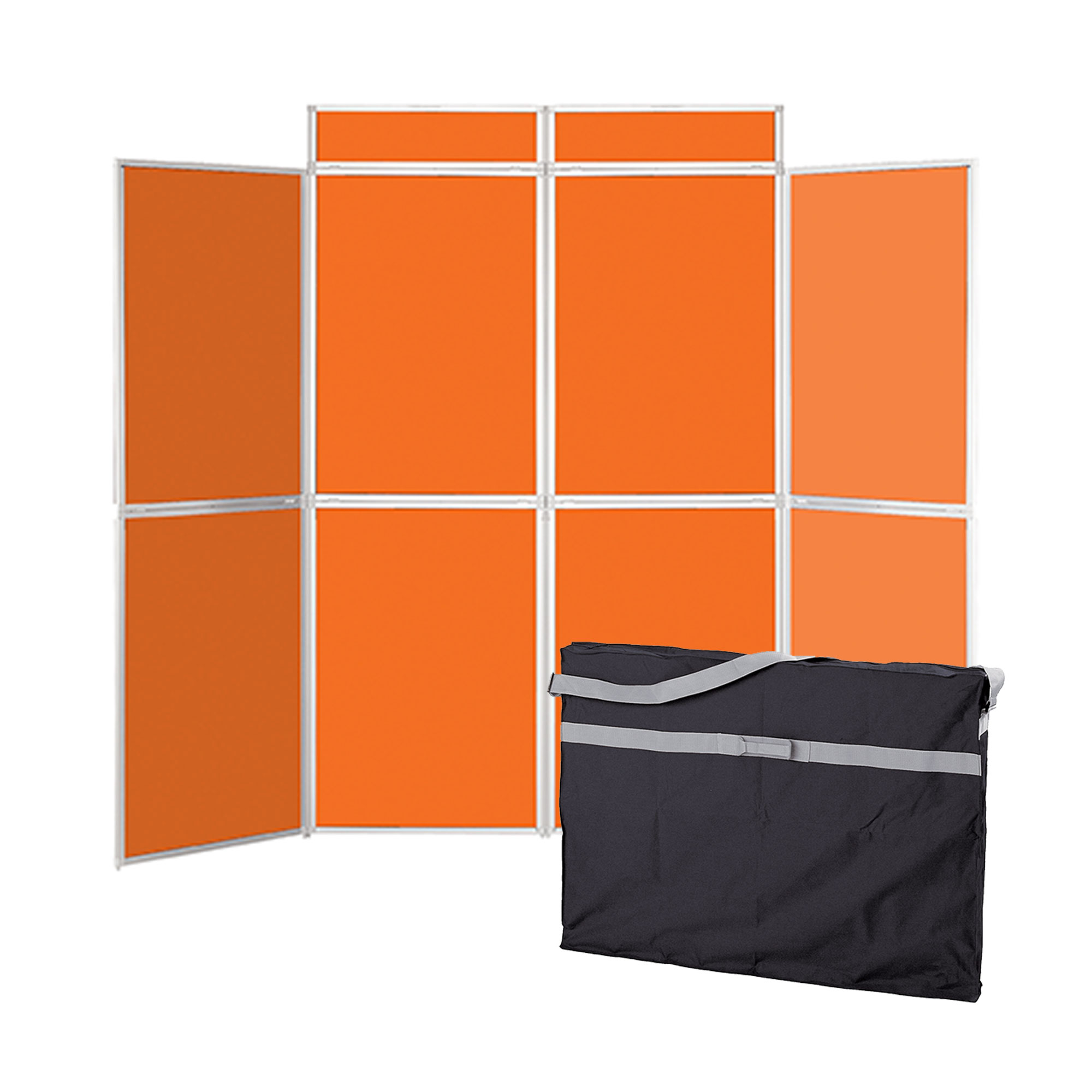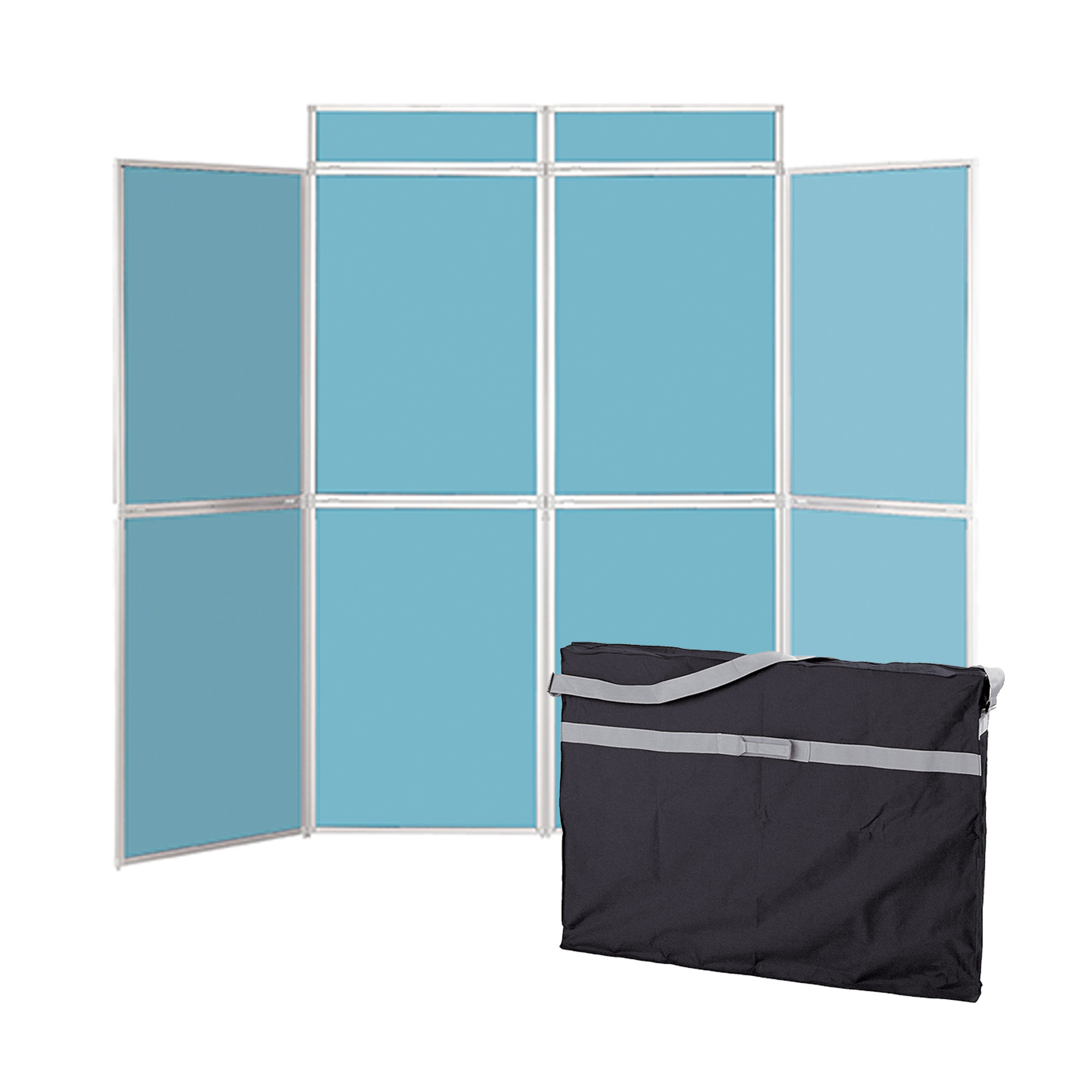 Robust aluminium framed display panels with interlocking gear hinges provide a sleek and professional display. Perfect for a larger temporary exhibition for displaying information, art, classwork or for tradeshow promotions. A portable and robust Folding 8 Panel Display System covered in loop nylon fabric allowing quick and easy display using pins or with self adhesive hook fasteners . 2 header panels included should they be required. A unique sliding mechanism locks the top and bottom panels securely together. Easy to put up and take down, a carry bag is included for protection, transporting and storing your display system.- Dimensions H x W (mm) Panels: 1000 x 700. Header Panels: 200 x 700. Overall Size: 2200 x 2800