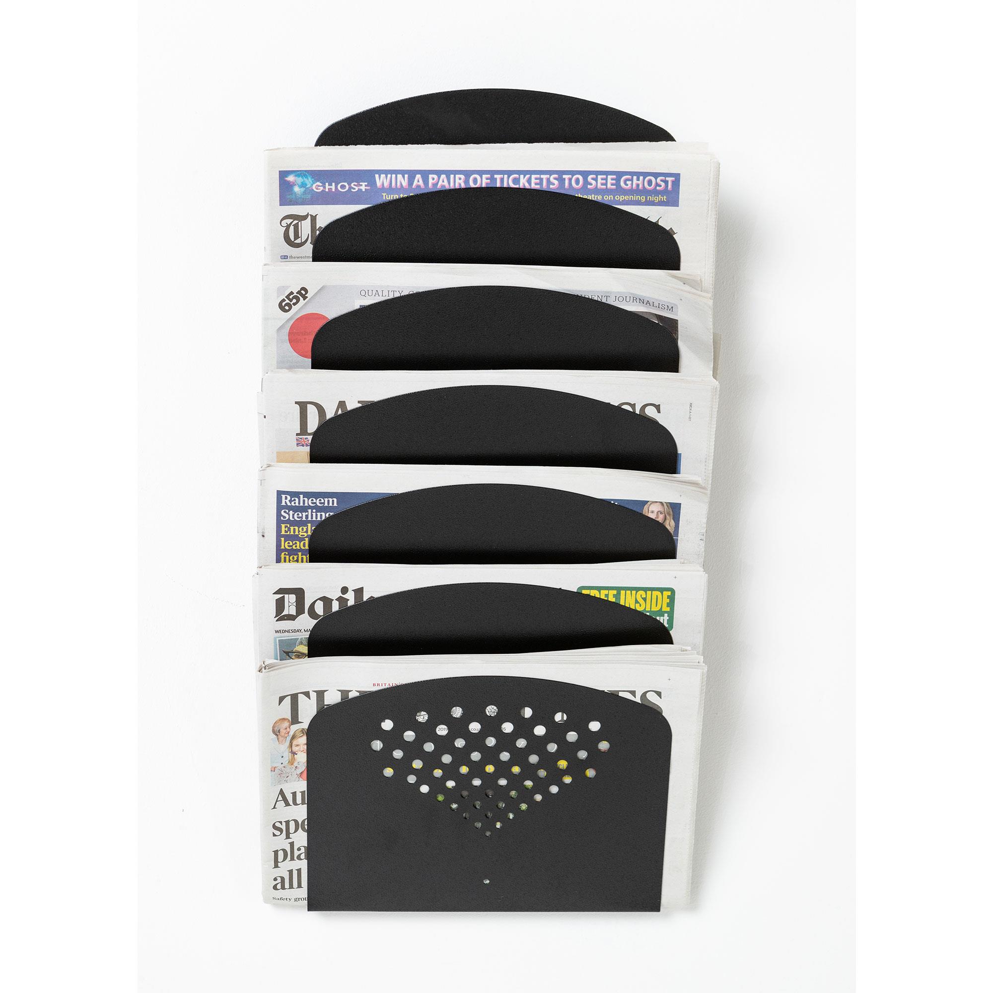 Tidy up your magazines and newspapers with this neat 7 pocket, wall-mounted rack. Black coated steel gives a modern look with 30mm of pocket space and open sides there’s plenty of room for holding newspapers and magazines. The rack comes with simple wall fixings.- 7 x 30mm Pockets