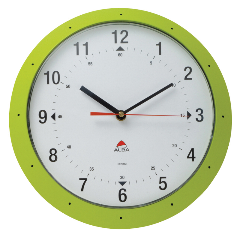 Clear 300mm diameter white-faced clock with black numbering available with a range of coloured bezels. Takes one AA 1.5v Batter (not supplied). 3-year warranty
