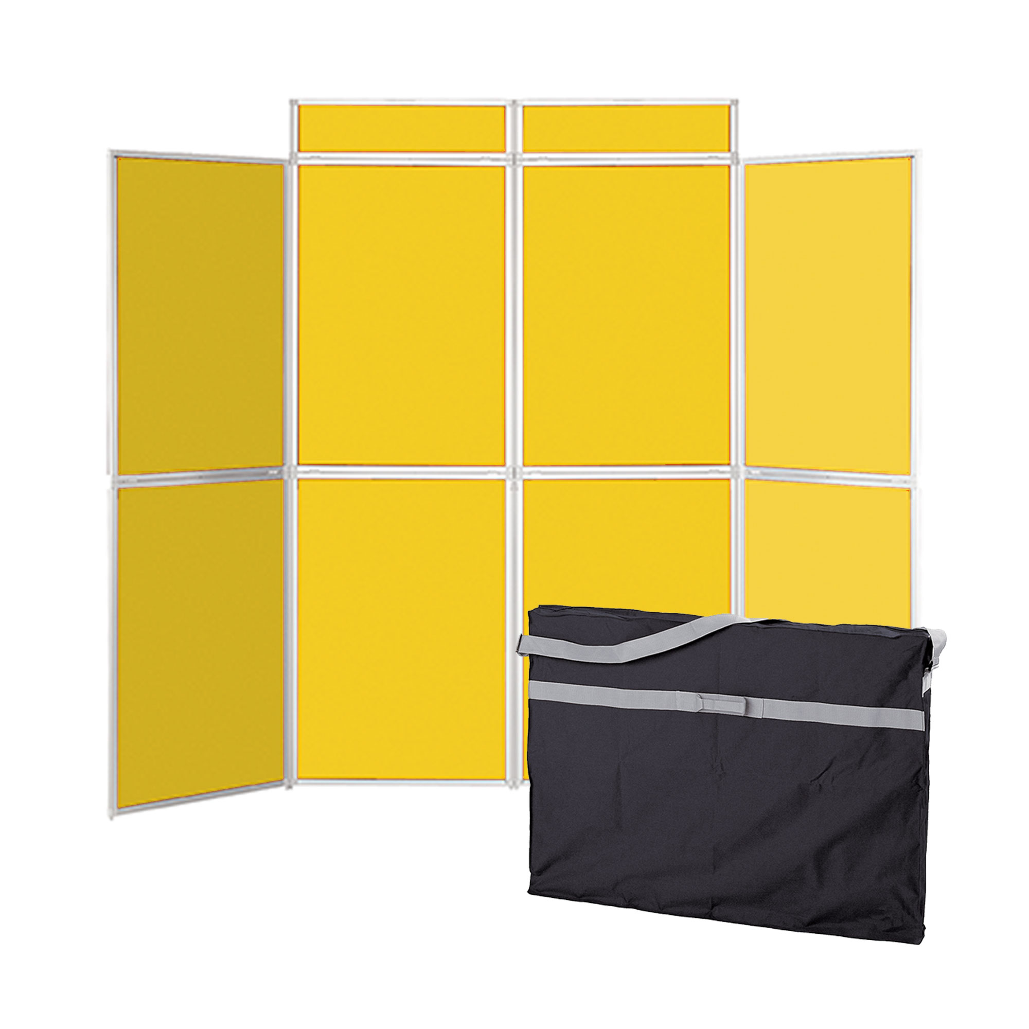 Robust aluminium framed display panels with interlocking gear hinges provide a sleek and professional display. Perfect for a larger temporary exhibition for displaying information, art, classwork or for tradeshow promotions. A portable and robust Folding 8 Panel Display System covered in loop nylon fabric allowing quick and easy display using pins or with self adhesive hook fasteners . 2 header panels included should they be required. A unique sliding mechanism locks the top and bottom panels securely together. Easy to put up and take down, a carry bag is included for protection, transporting and storing your display system.- Dimensions H x W (mm) Panels: 1000 x 700. Header Panels: 200 x 700. Overall Size: 2200 x 2800