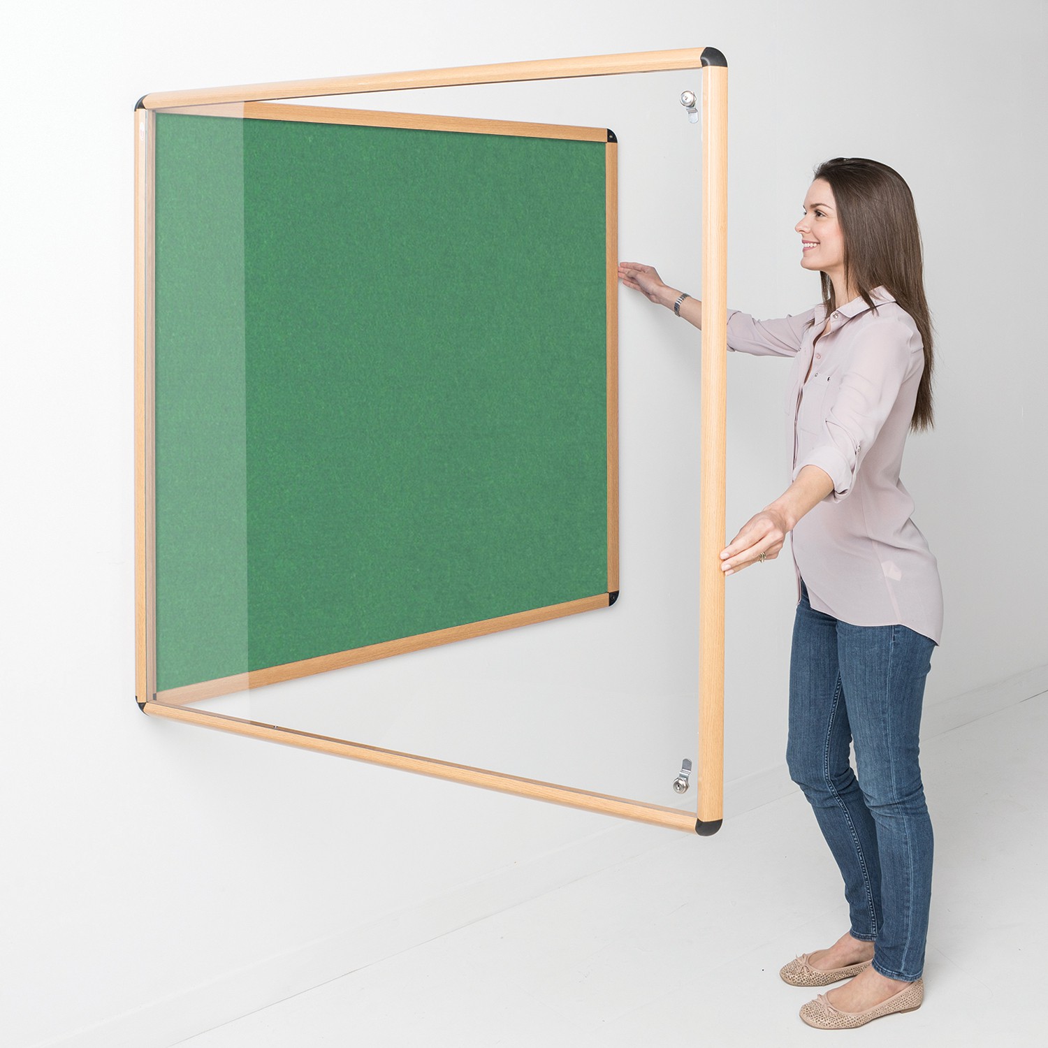 Contemporary aluminium framed lockable display boards with Firewall® Resist-a-Flame core is designed to protect the information on display against casual interference in busy public spaces. Firewall® is a self-coloured pinnable noticeboard core with fire resistant properties tested and classified as Class B according to the European Reaction to fire test BS EN 13501-1. Clear covers are tested separately to BS EN 13501-1 and classified as Class B. This identifies that the product meets the public area building regulations for mounting in sensitive areas.Almost entirely constructed from recycled and recyclable materials and assembled in the UK to the highest standards featuring an attractive contoured frame, quality hinges, matching locks, full length glazing bars and shatterproof 3mm clear PET covers. Under laboratory conditions, the Firewall® core material can achieve an NRC (Noise Reduction Coefficient) rating up to an impressive 0.8. This makes it an ideal product for use within busy public spaces, learning and office environments.