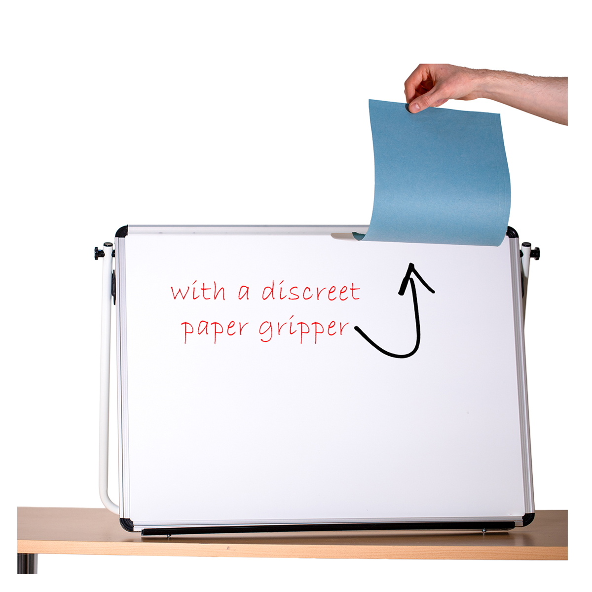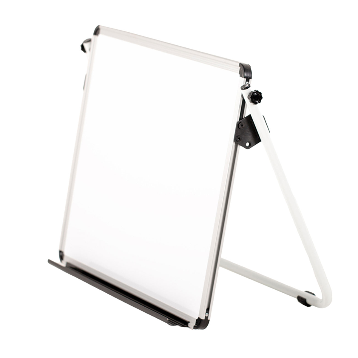Desktop Whiteboard A compact dry wipe, tabletop easel that can be used by children or staff on classroom tables, for drawing or writing. Also supplied with paper hangers. Folds for storage. Choice of satin aluminium or brightly coloured frame. Steel surface accepts magnets.