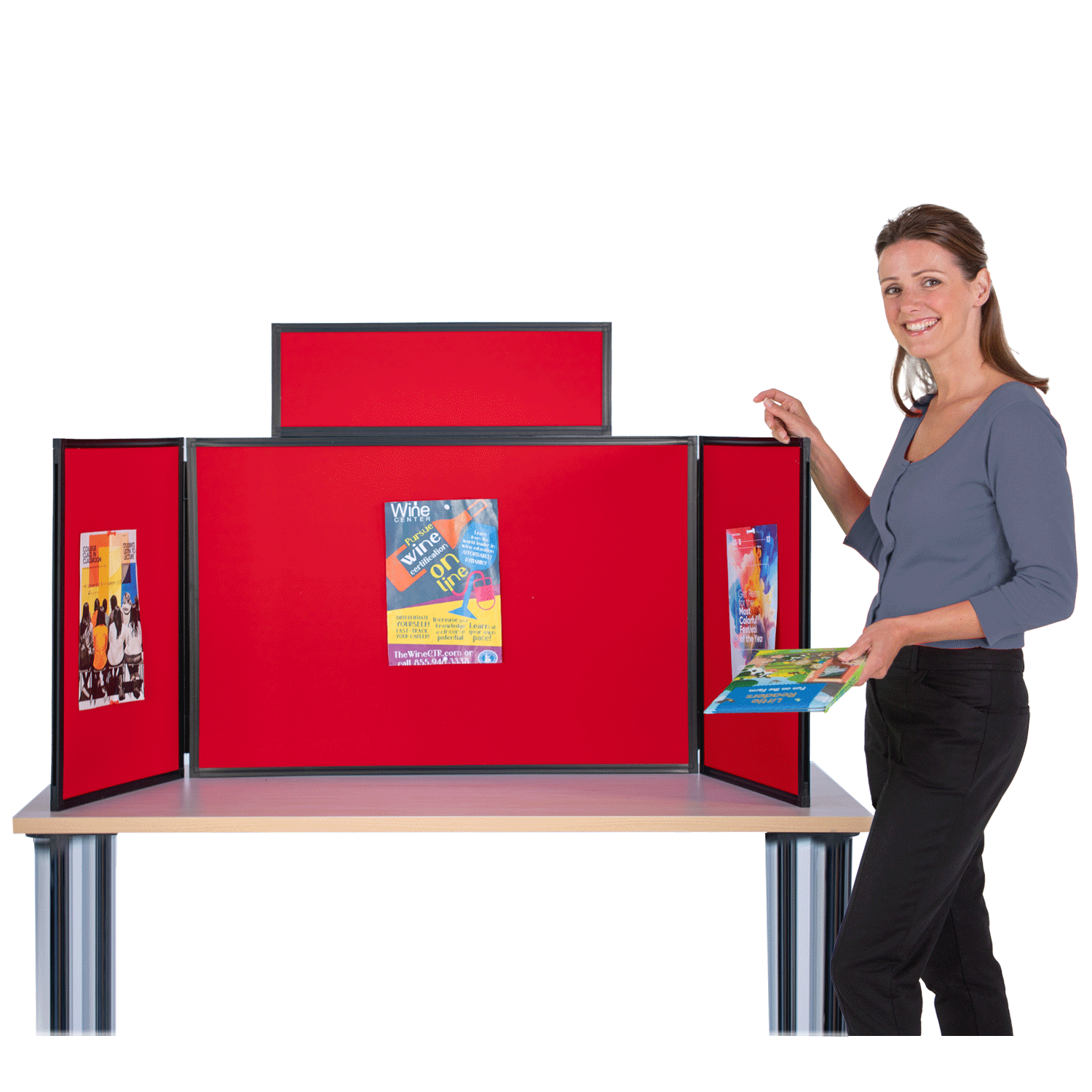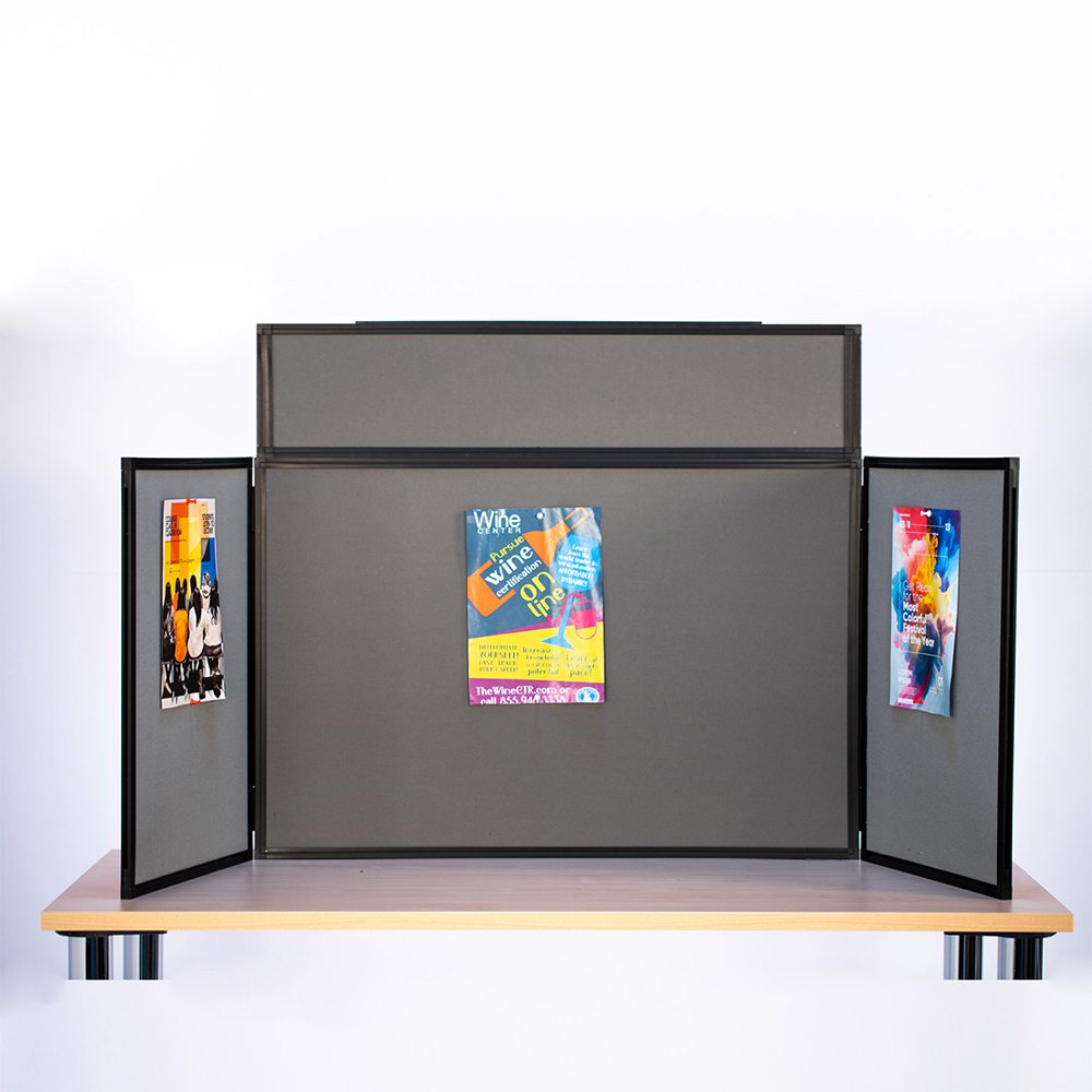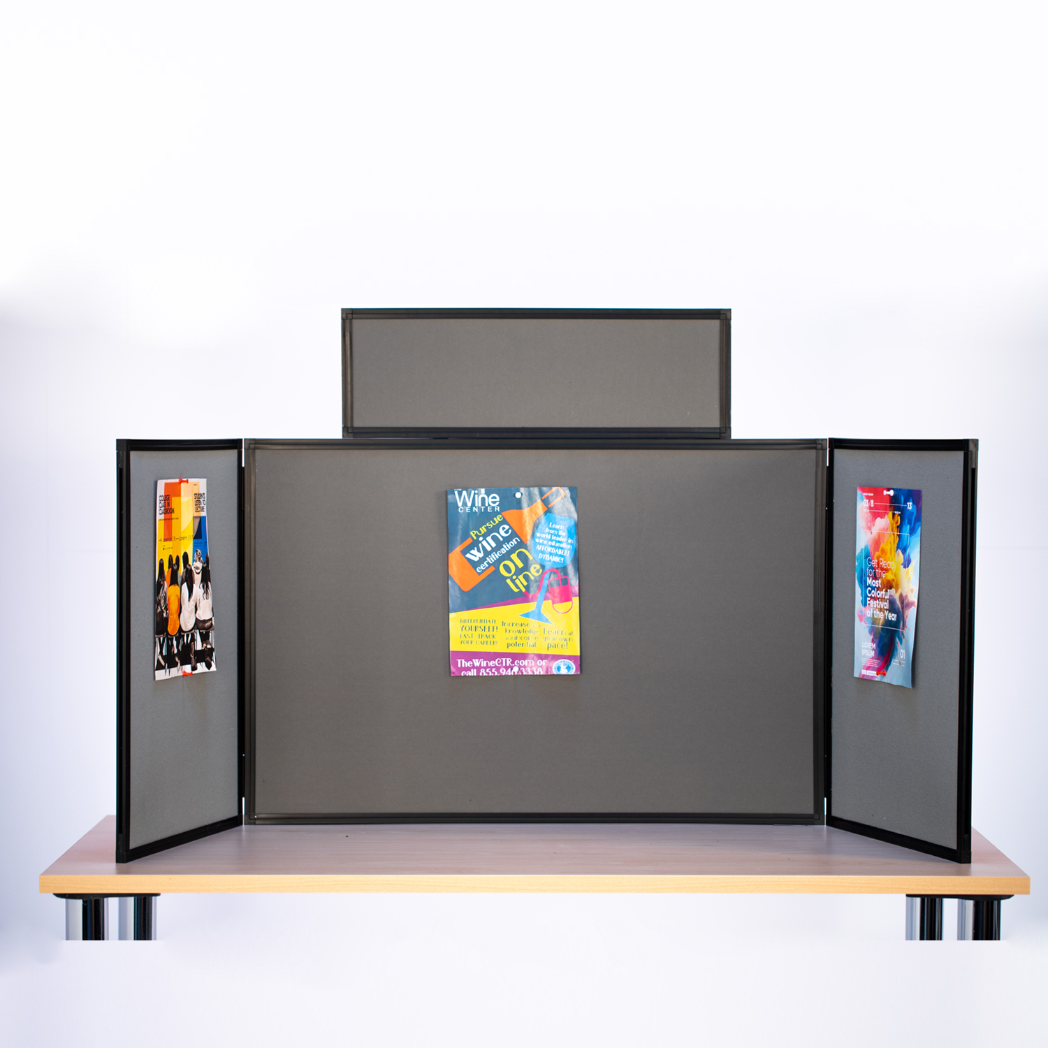 Everything you need for a larger temporary exhibition for displaying information, art, classwork, tradeshow or promotions. A portable and lightweight Folding 6 Panel Display System covered in loop nylon fabric allowing quick and easy display using pins or adhesive hook fasteners. A header panel is also provided should you require it. Easy to put up and take down, a carry bag is included for protection, transporting and storing your display system.