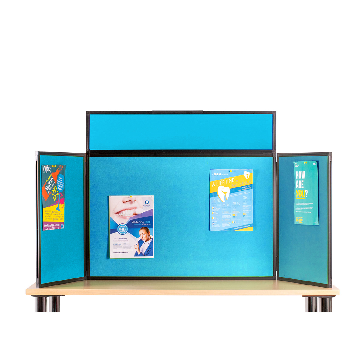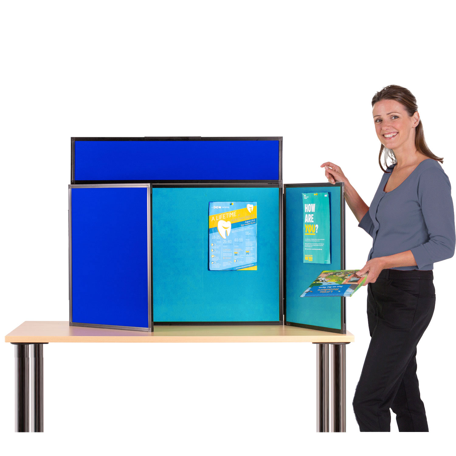 Our Table Top Folding Display System will enable you to set up your tabletop display in minutes, providing a smart backdrop for your class presentation, exhibition or information stand. The panels are covered with loop nylon fabric allowing quick and easy display using pins or our Busyfix® coins. Easy to put up and take down, a carry bag is included for protection, transporting and storing your display system. Can be used with or without the header panel.