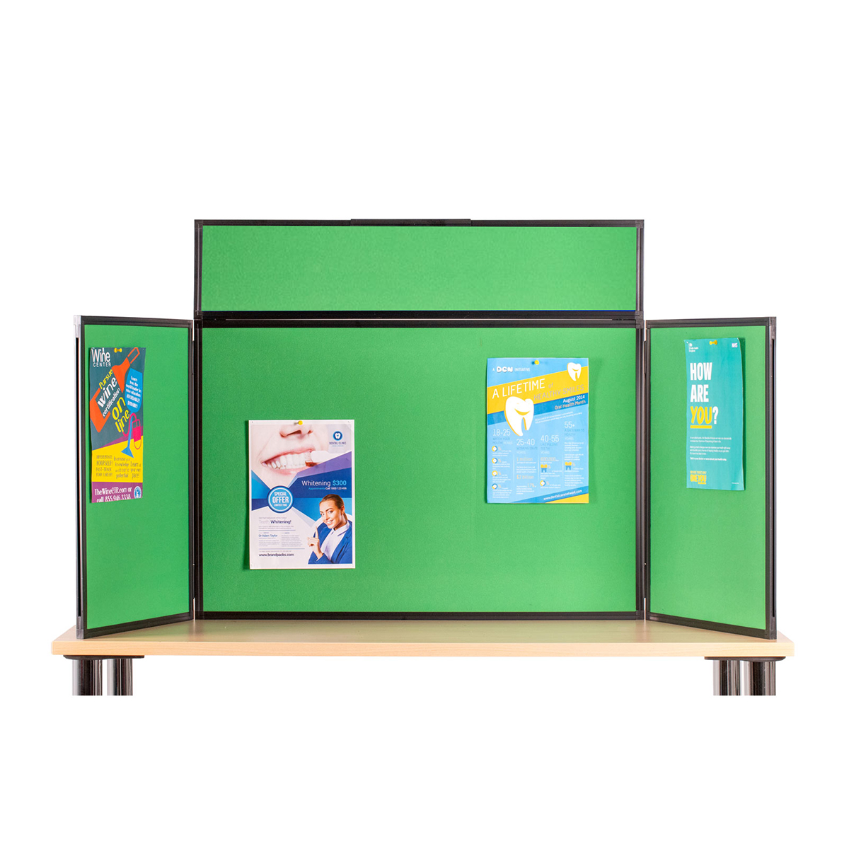 Our Table Top Folding Display Systems will enable you to set up your table top display in minutes providing a smart backdrop for your class presentation, exhibition or information stand. The panels are covered with loop nylon fabric allowing quick and easy display using pins. Easy to put up and take down, a carry bag is included for protection, transporting and storing your display system. Can be used with or without the header panel.