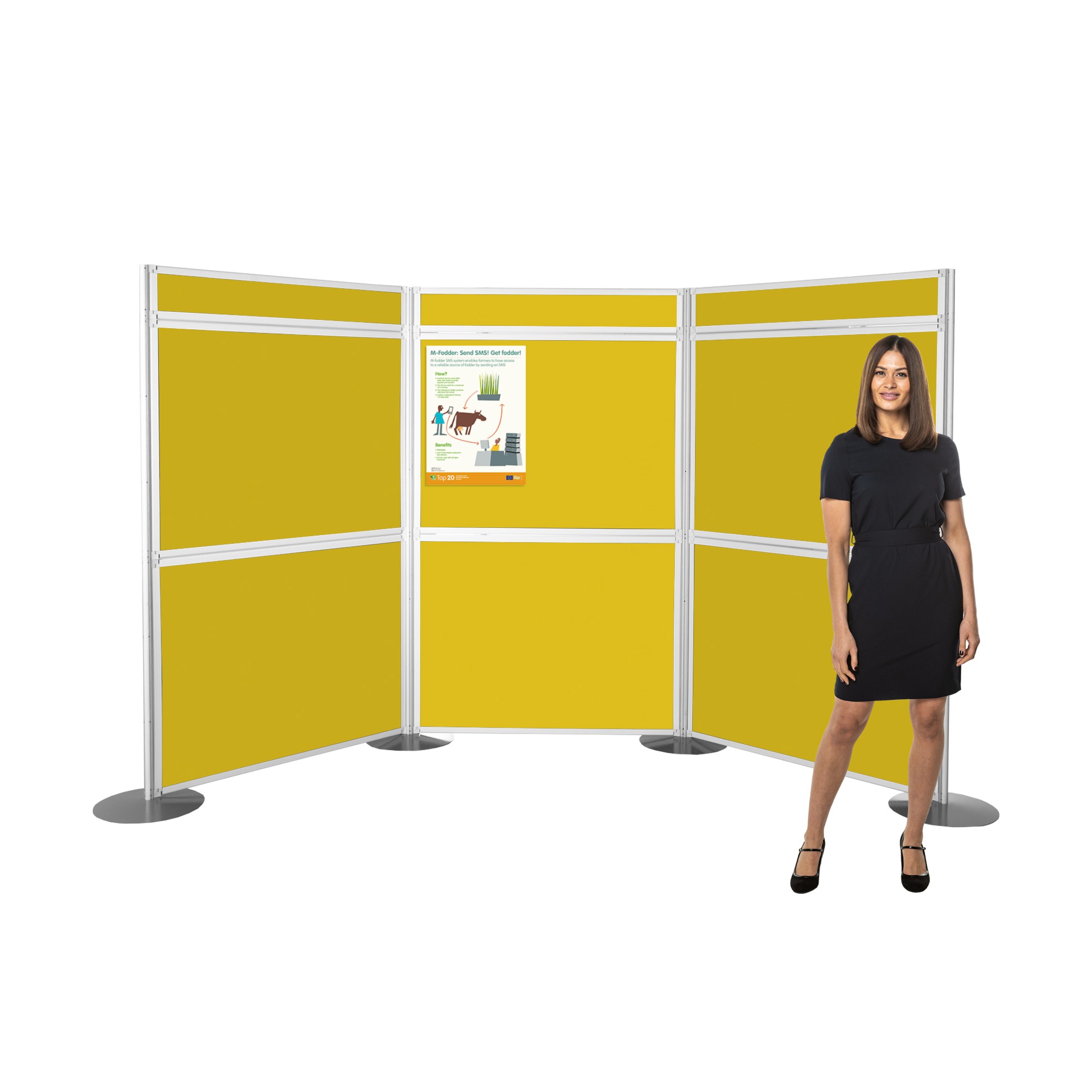The panels easily clip onto specially designed four-way poles with circular steel bases and lock into position, preventing any unintentional movement. the four-way pole design allows panels to connect at right angles offering greater flexibility in your configuration choices.