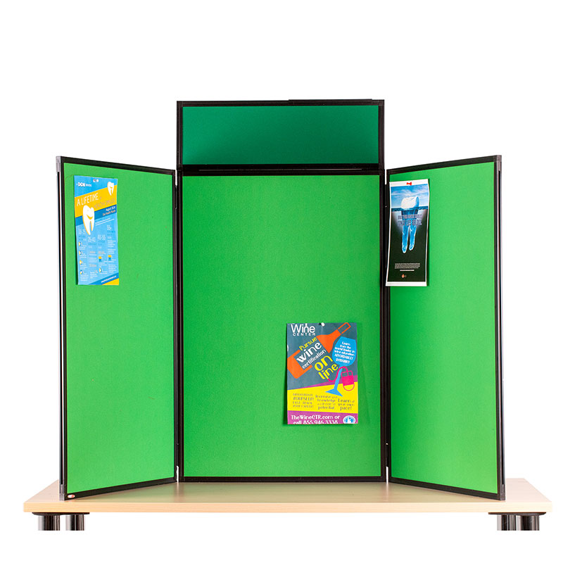 Our Table Top Folding Display Systems will enable you to set up your table top display in minutes providing a smart backdrop for your class presentation, exhibition or information stand. The panels are covered with loop nylon fabric allowing quick and easy display using pins. Easy to put up and take down, a carry bag is included for protection, transporting and storing your display system. Can be used with or without the header panel.