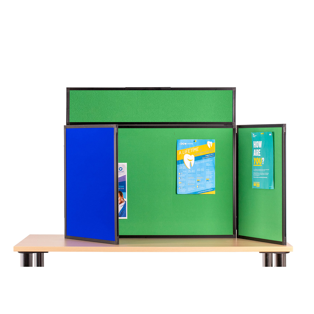 Our Table Top Folding Display Systems will enable you to set up your table top display in minutes providing a smart backdrop for your class presentation, exhibition or information stand. The panels are covered with loop nylon fabric allowing quick and easy display using pins. Easy to put up and take down, a carry bag is included for protection, transporting and storing your display system. Can be used with or without the header panel.