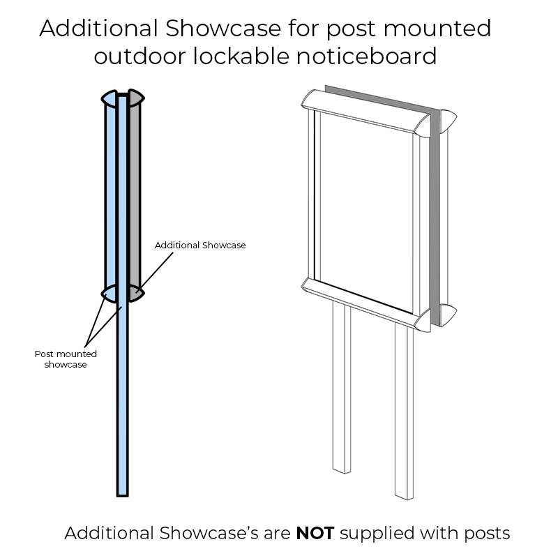 - Additional showcases are also available to create a double-sided showcase - the additional showcase can be mounted to the same pair of posts (additional fixings supplied)