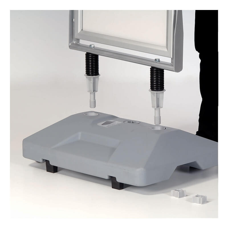 This large double sided wind sign is designed to take posters (H) 1524 x (W) 1016mm. Fill the base with water for maximum stability. The rubber seal ensures this product is waterproof and the easy to open snap frames include anti-reflex covers. 2 wheels aid mobility and there is an optional carry tool sold separately. 60x40” Sign - Overall height; 1875mm Poster size; (H) 1524 x (W) 1016mm Visible copy size: (H) 1512 x (W) 1004mm- Overall height; 1875mm