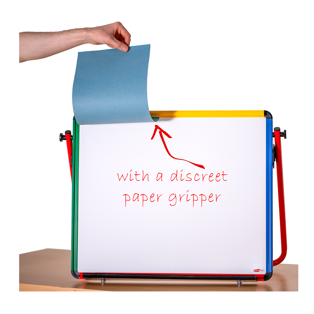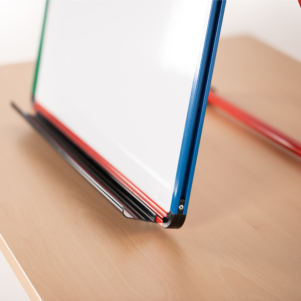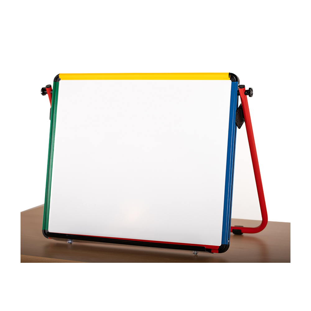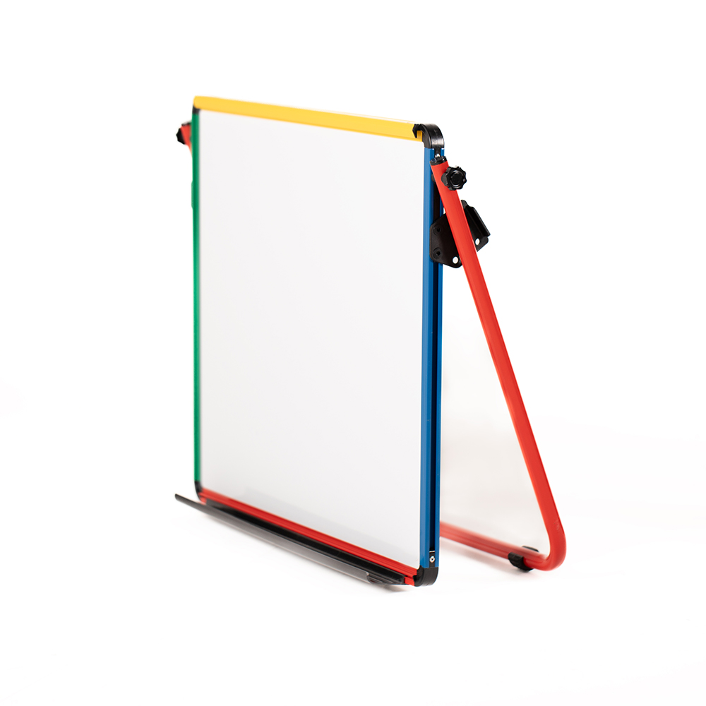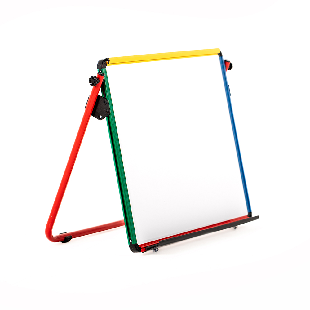 A compact desktop easel that can be used by children or staff on classrooom tables for drawing, presenting or writing. Coloured frame with drywipe surface that accepts magnets. Supplied with a discreet paper gripper.This desktop easel whiteboard folds down for compact storage. Easy to store and light to carry.