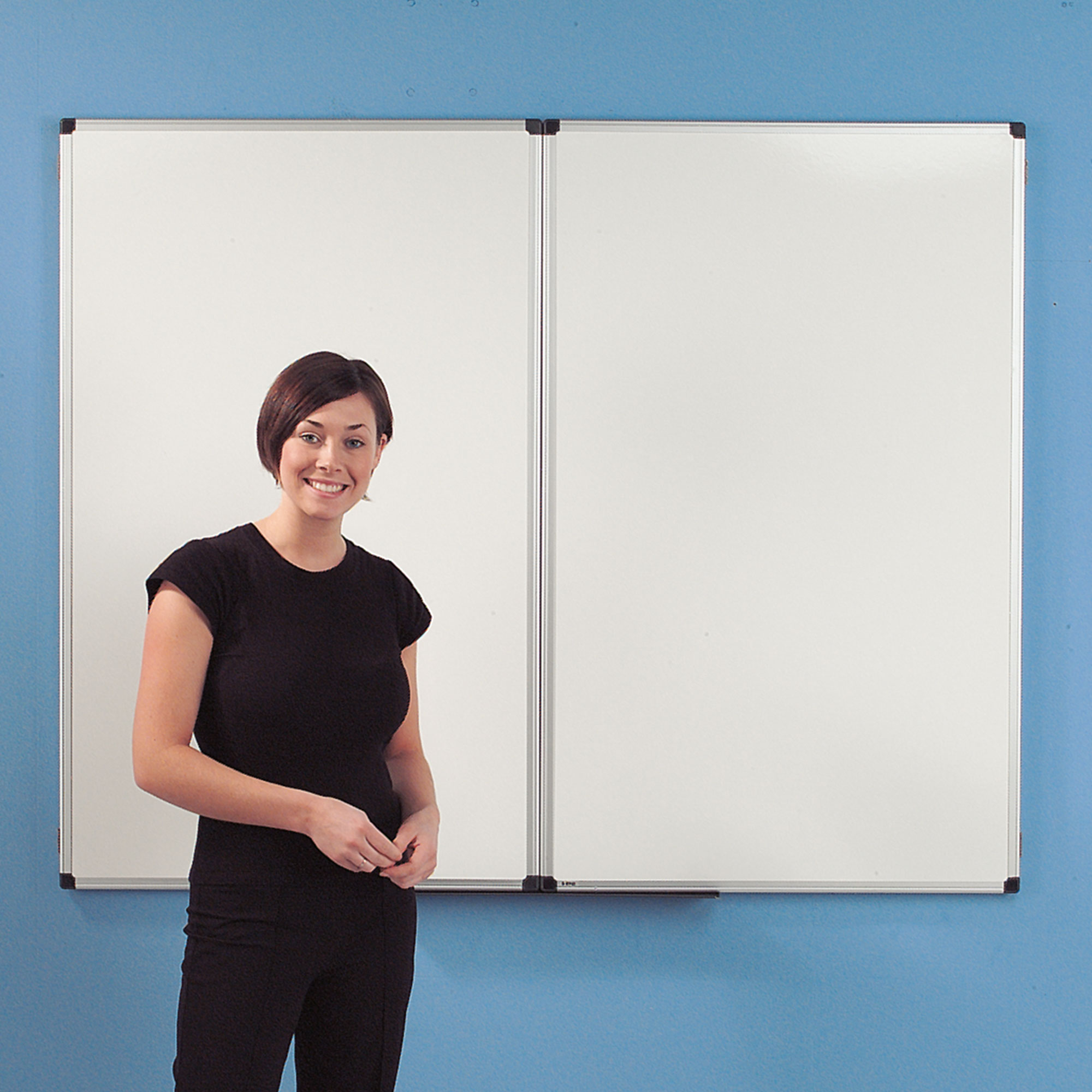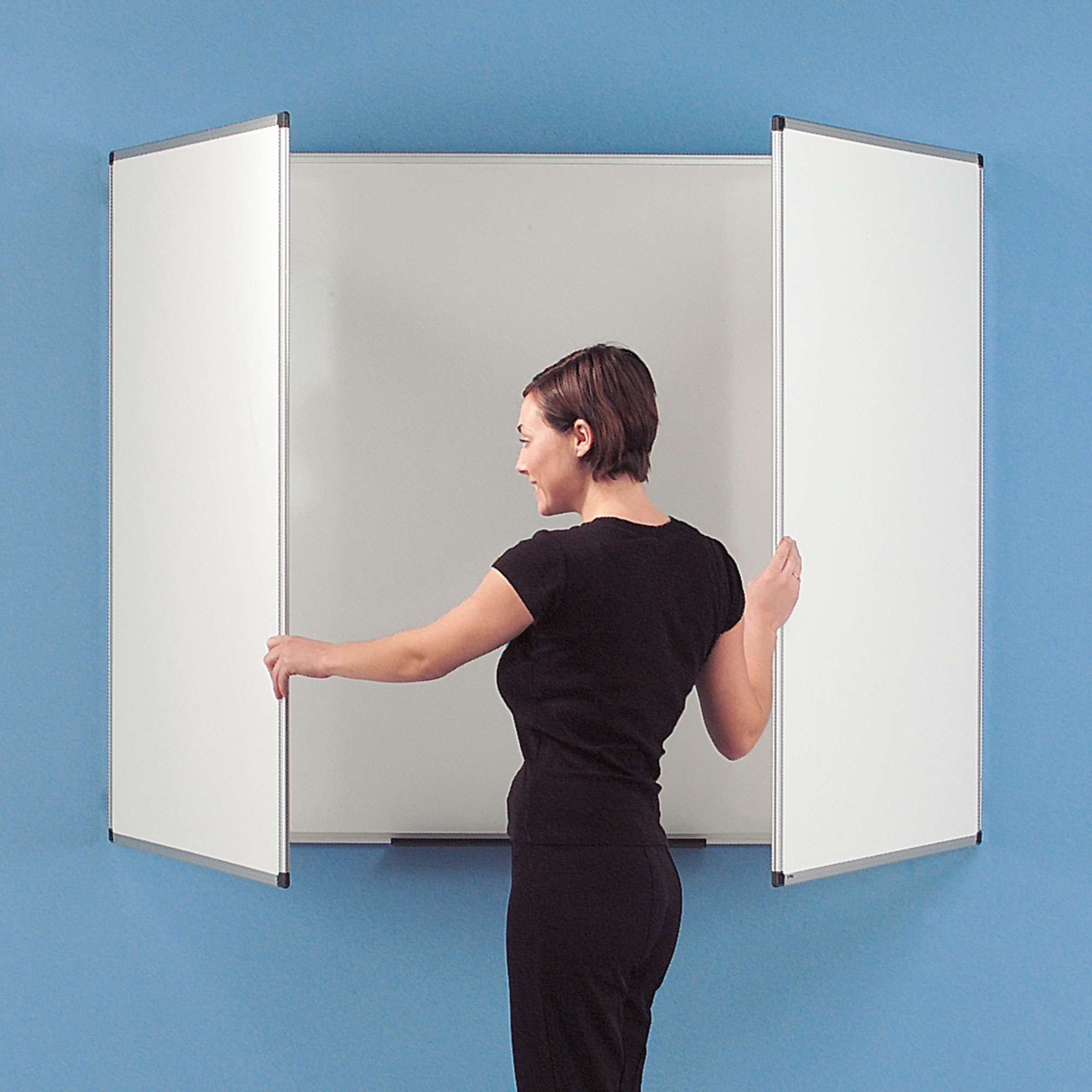 These space-saving whiteboards allow you to cover confidential information or reveal pre-prepared work. The laminate surface is suitable for use with drywipe pens. Available in 5 sizes, these boards open up to double the closed surface area.|