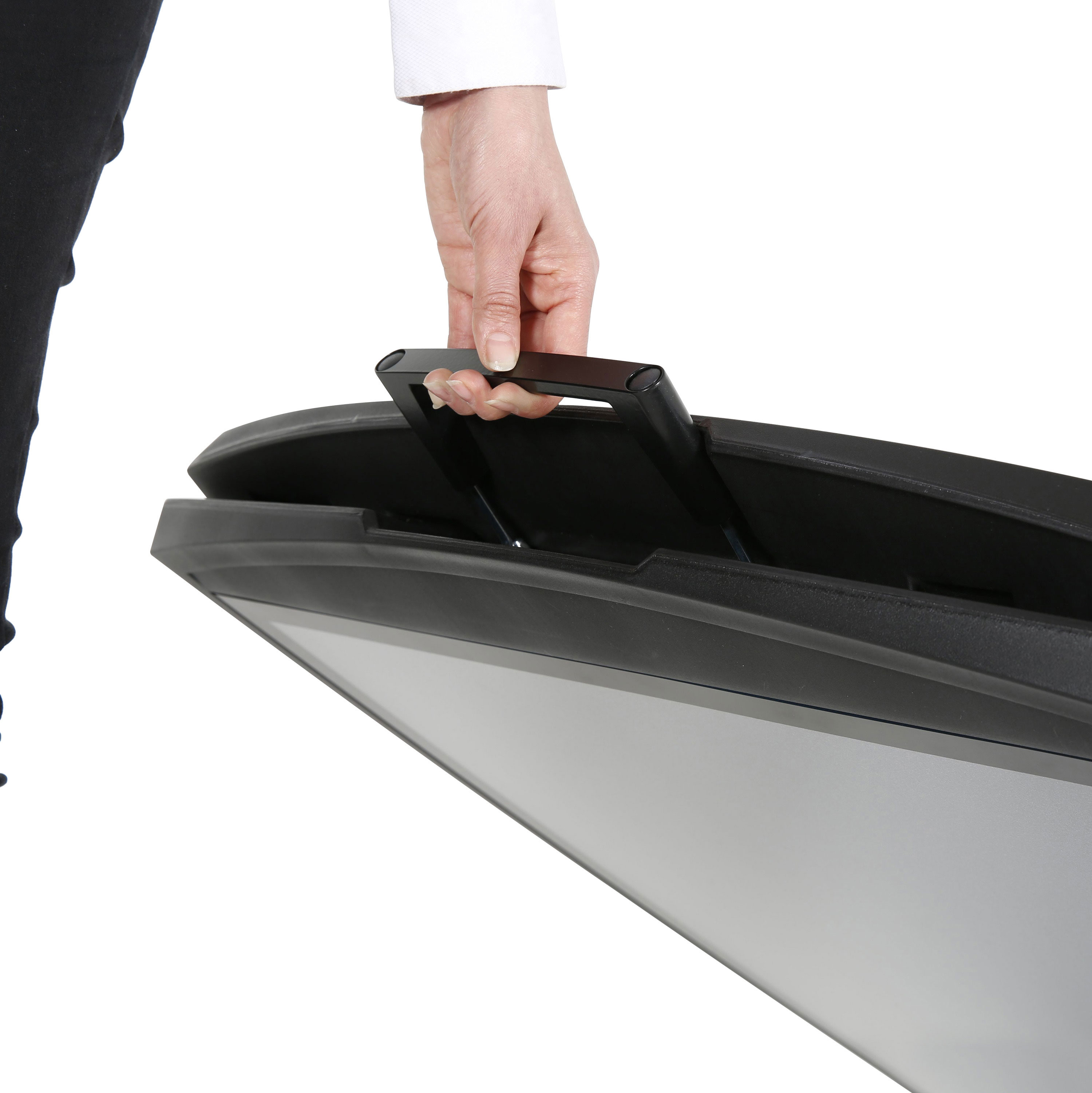 The sign features UV and Anti-Flex Protection, which recessed sign areas to shield graphics from fading and flexing, ensuring long-lasting clarity. It is a portable design with a hidden handle, allowing for easy transport when the 13 kg A-frame is closed.