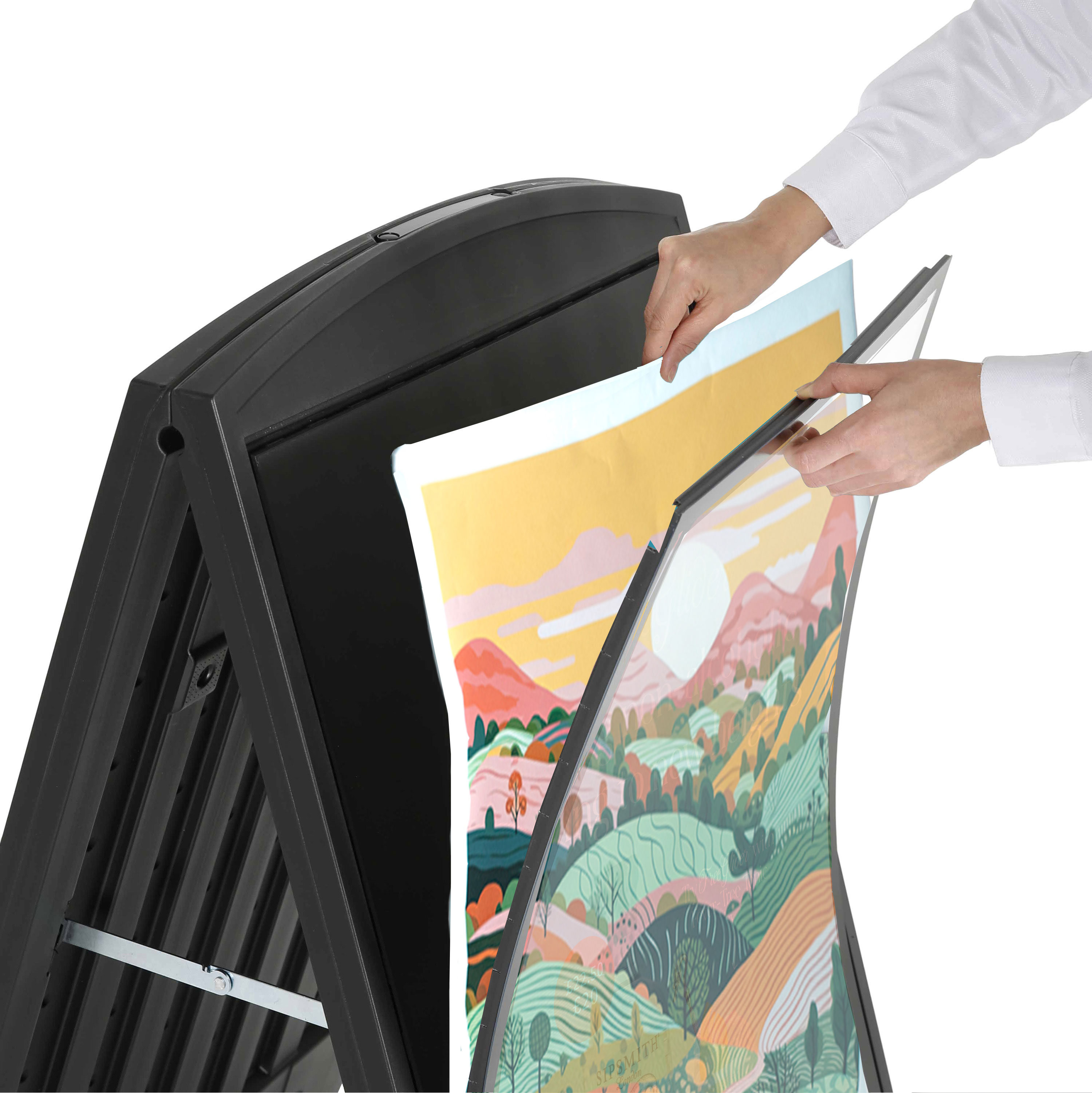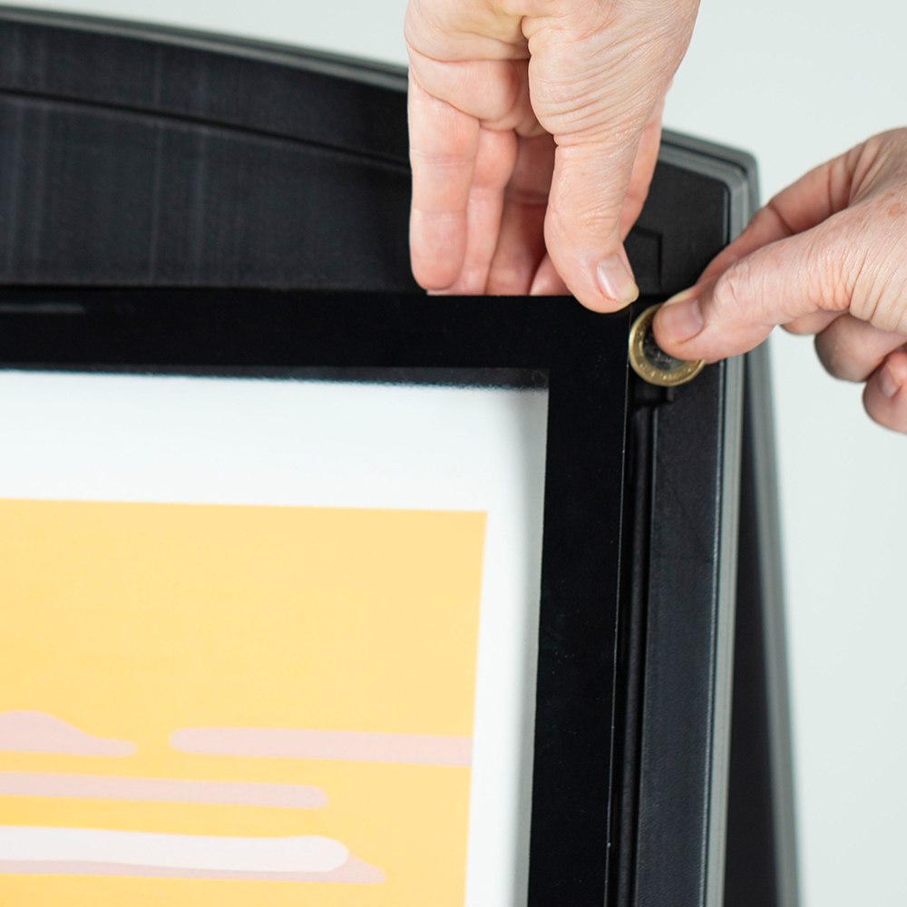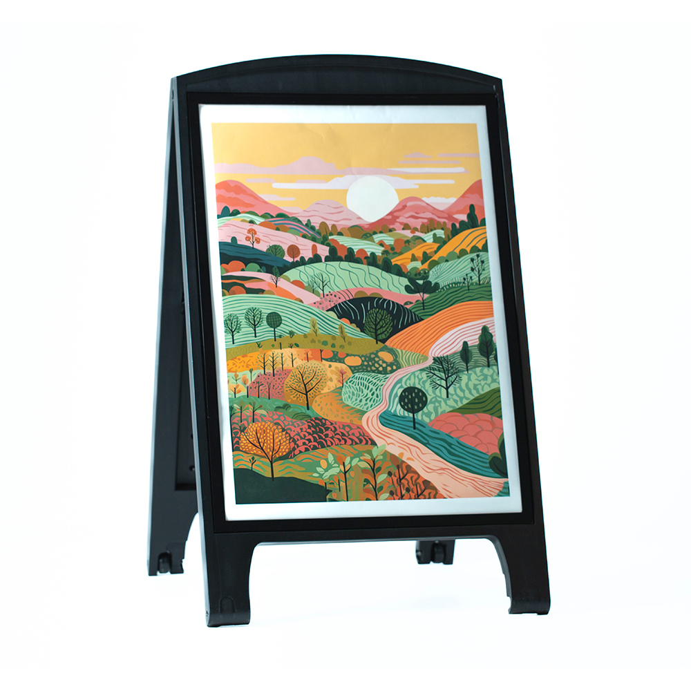 This durable weather-resistant A-Frame pavement sign in Grey or Black is built to withstand outdoor elements. It has a double-sided display that can hold two A1 posters, one on each side, measuring 594 x 841 mm or 23.4 x 33.1 inches) or maximum visibility.