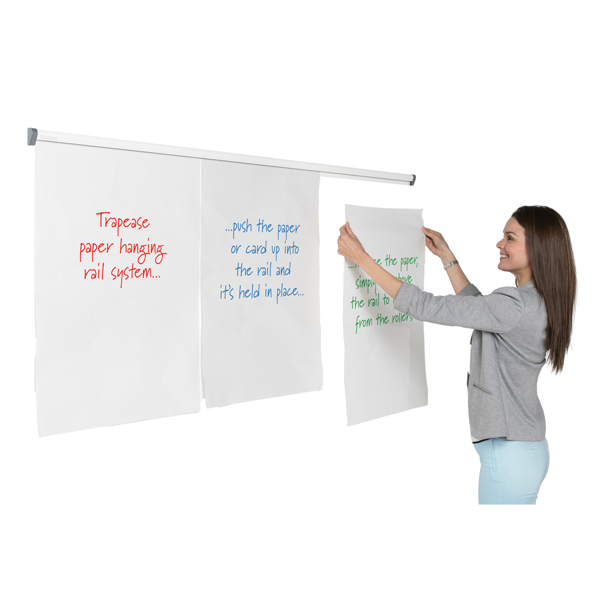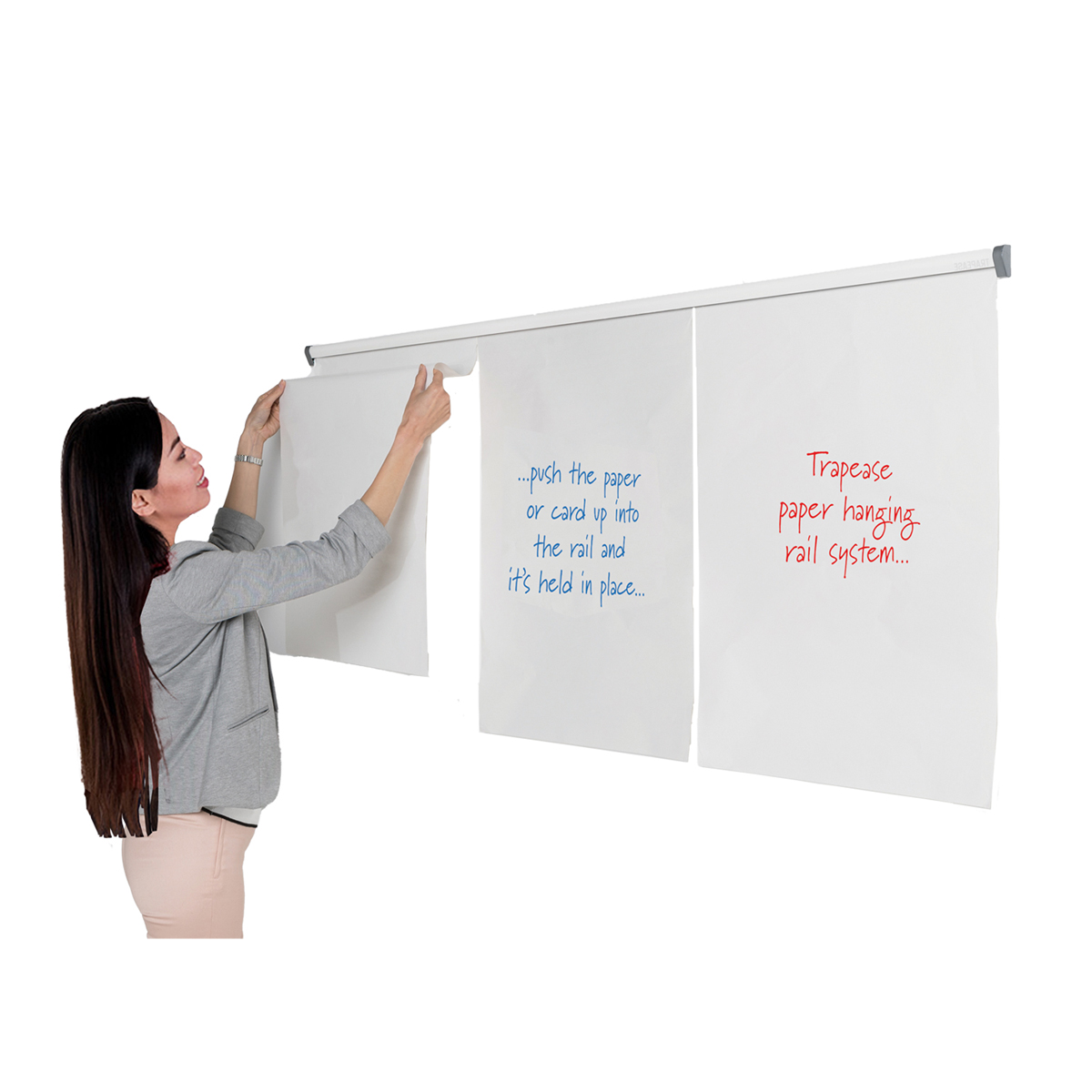The Trapease® Wall mounted Paper Hanging System is an innovative solution for displaying artwork, presentation notes, and materials from brainstorming sessions. To use it, simply insert a sheet of paper; the specially designed rollers grip the paper securely in place. To release the paper, just lift it.